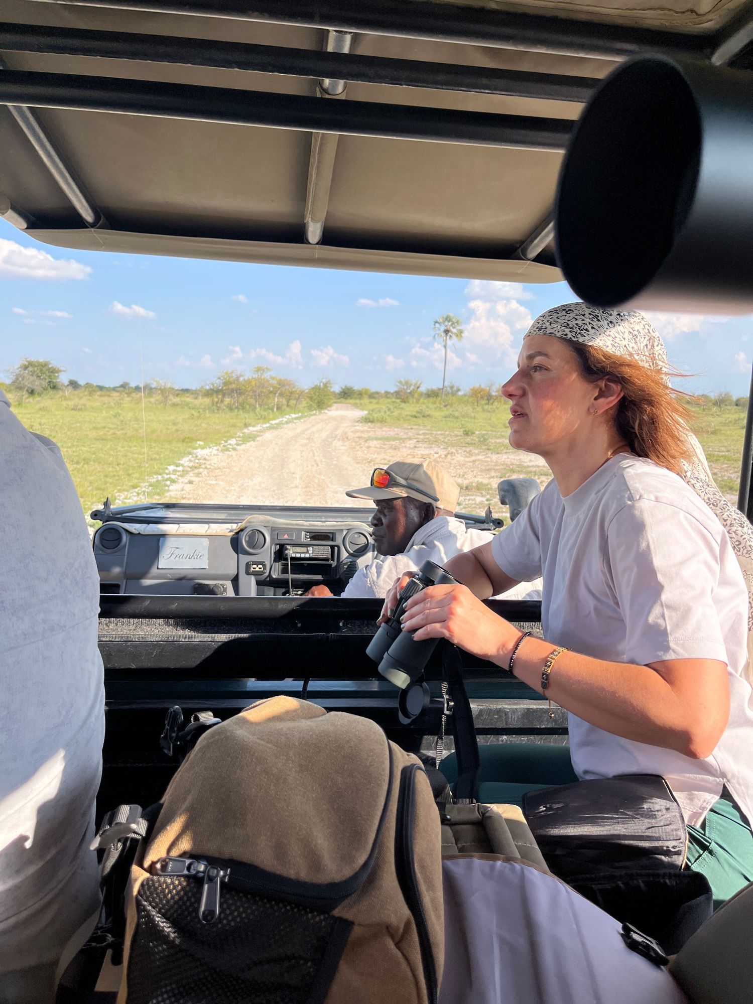 The image shows a woman with reddish-brown hair wearing a white t-shirt and patterned headscarf looking through binoculars from the back of an open-top safari vehicle. A Black man wearing a white shir…read more