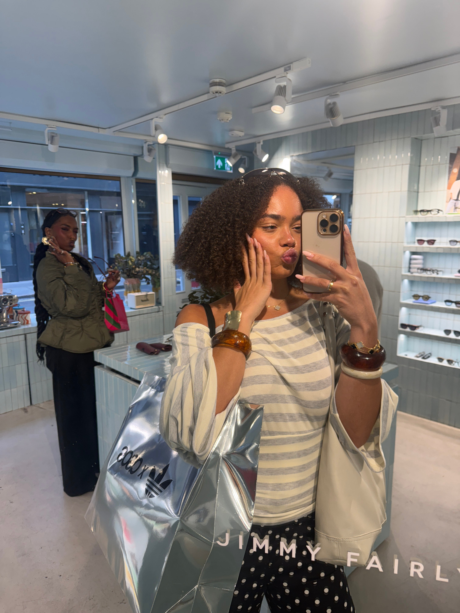 A woman with curly hair is taking a selfie in a mirror inside a shop. She is holding a phone in her right hand and posing with her left hand near her face. She is wearing a striped top, polka dot pantβ¦read more