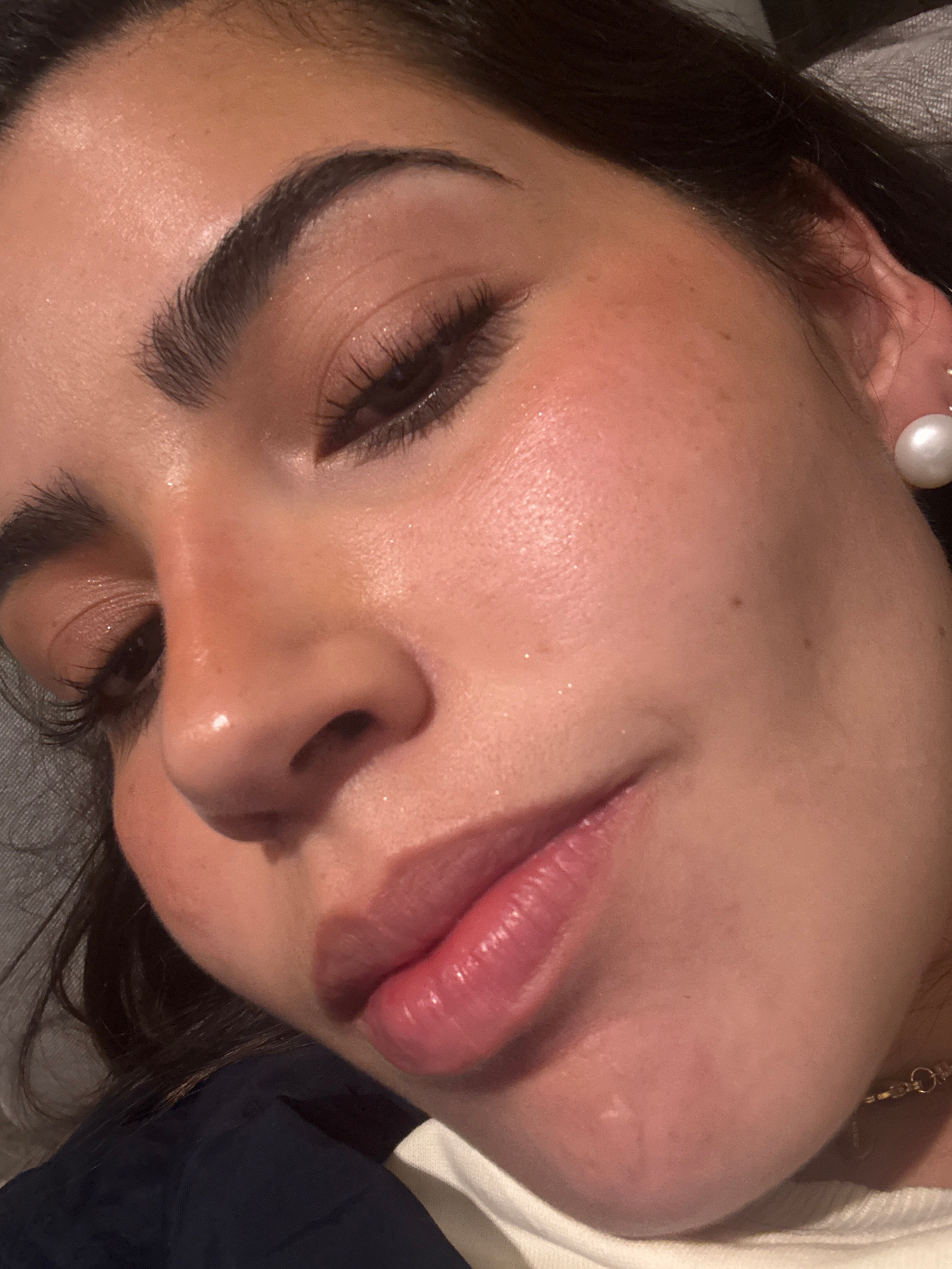 A close-up, high-angle shot depicts a person's face. The person has dark hair and fair skin, with prominent eyebrows and eyelashes. The eyes are closed. The lips are full and glossy. A pearl earring i…read more