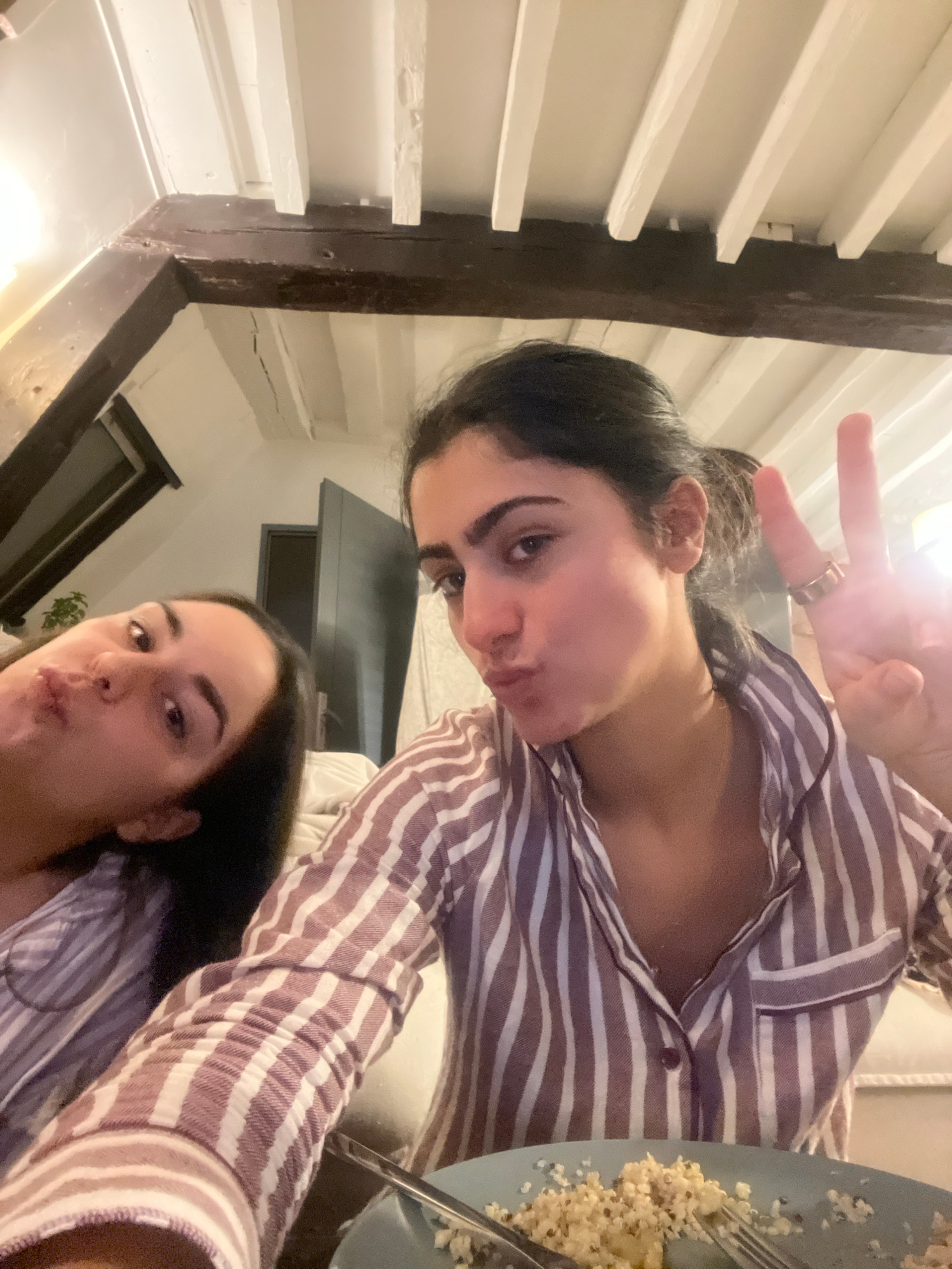 Two women pose for a selfie. One woman is in the upper portion of the frame and is holding up her fingers in a peace sign. She has dark hair pulled back, and she is wearing a striped pajama top. A pla…read more