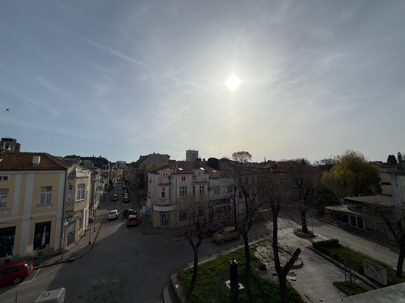 The image depicts an urban scene in Varna, Bulgaria on a sunny day. The view is from an elevated position, overlooking a street intersection and adjacent buildings. The architecture is characterized b…read more