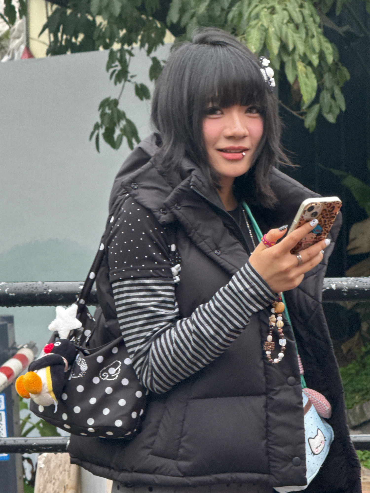 An individual is depicted outdoors in Nan'an District, China, positioned in front of a grey wall and green foliage, with a black metal railing partially obscuring the lower half of the scene. The subj…read more