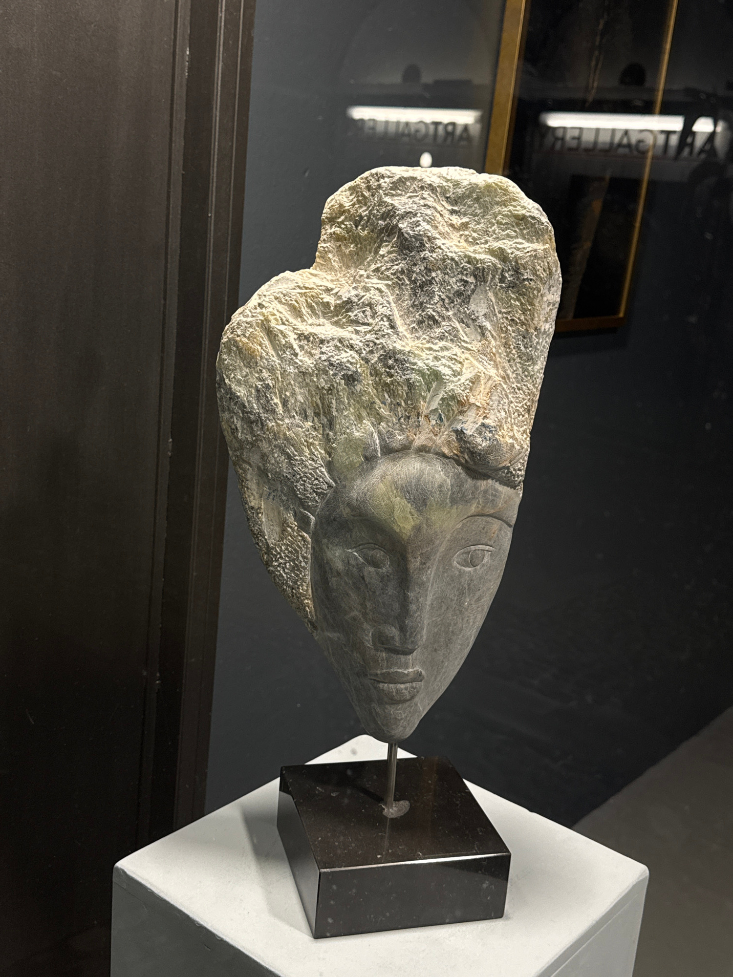 A close-up shot presents a stone sculpture of a fish's head mounted on a minimalist stand. The sculpture, rendered in a rough, textured stone, shows a fish with a distinct eye and mouth. It is affixed…read more