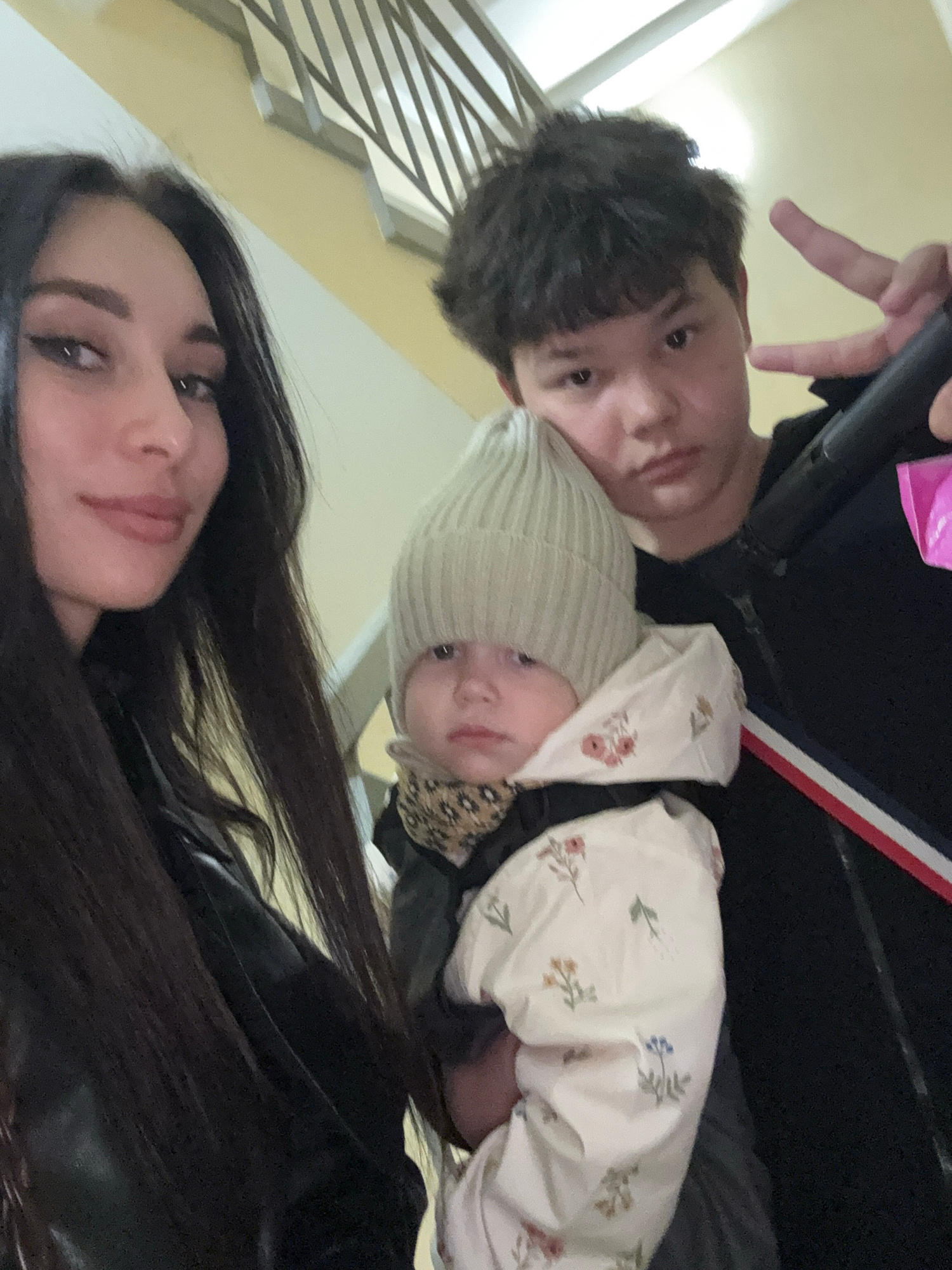 A selfie taken indoors features three individuals: a woman with dark hair and visible makeup (eyeliner and lip gloss), a young man with dark, short hair, and an infant wearing a light-colored floral-p…read more