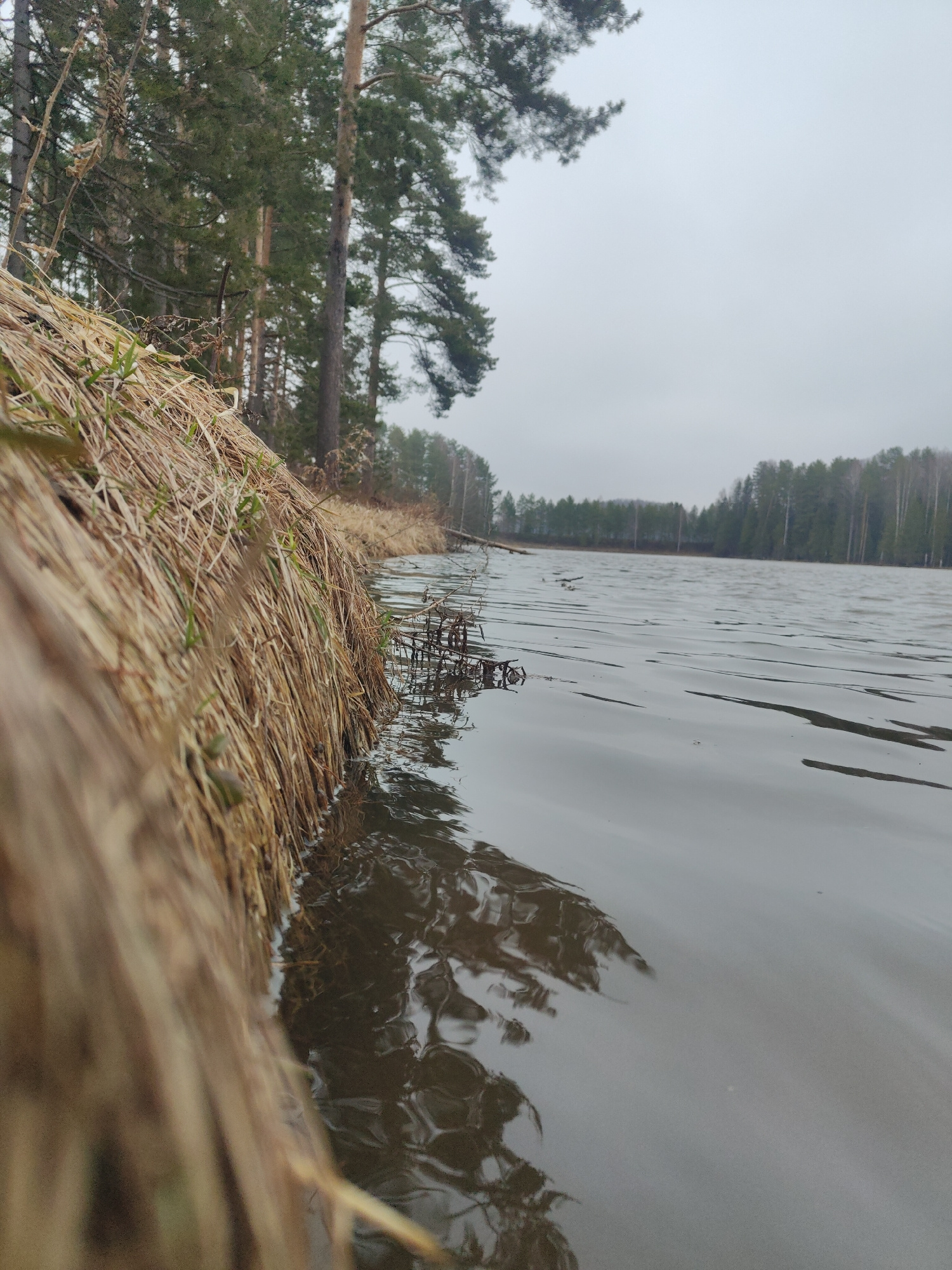 This media file captures a tranquil natural landscape in Мишкино, Russia, under an overcast sky. The scene features a calm body of water, likely a lake or wide river, bordered by a forested bank. In…read more