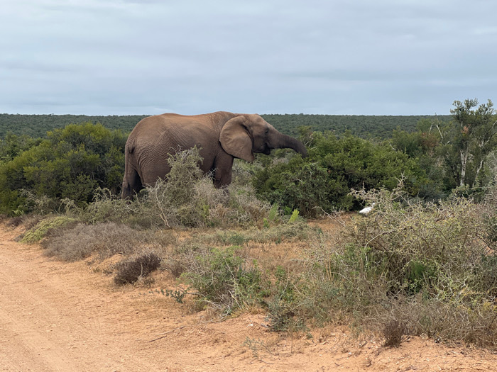 An African elephant (Loxodonta africana) stands in dense bushveld vegetation within the Sundays River Valley Local Municipality, South Africa. The elephant, positioned in the middle-left, is light broβ¦read more