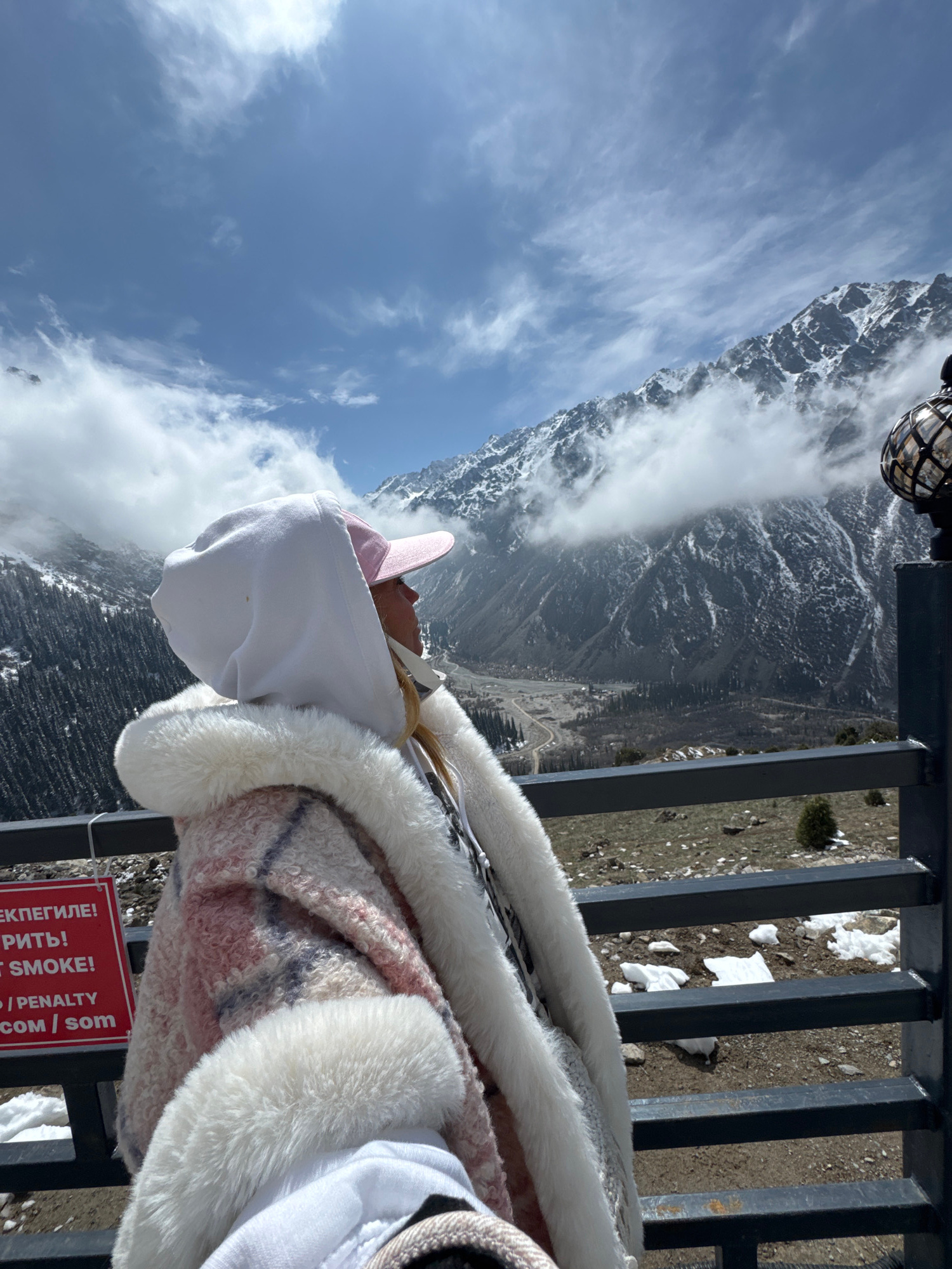 A medium, oblique shot shows a person wearing a white rabbit-eared hat and a plaid, faux fur-lined coat, positioned on an outdoor metal railing. In the background is a mountainous, cloud-covered lands…read more