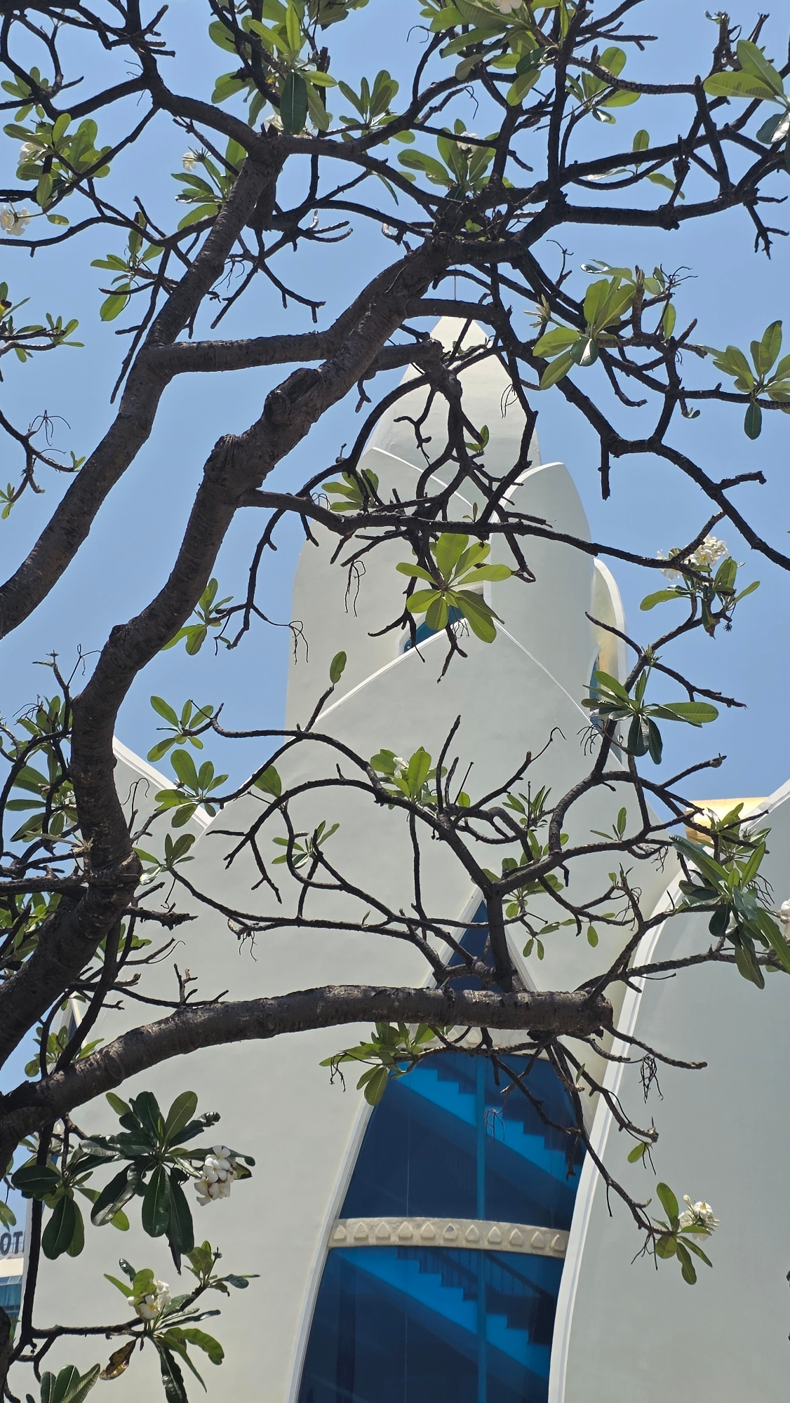 The image captures a low-angle view of a plumeria tree with sparse foliage and white flowers, set against a backdrop of a clear blue sky and a contemporary building. The building's architecture featur…read more