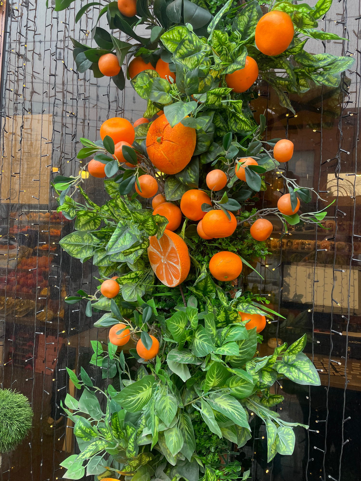 The image presents a vertical decorative display composed of artificial orange fruits and green foliage, positioned against a reflective glass surface in Yerevan, Armenia. The display features numerou…read more