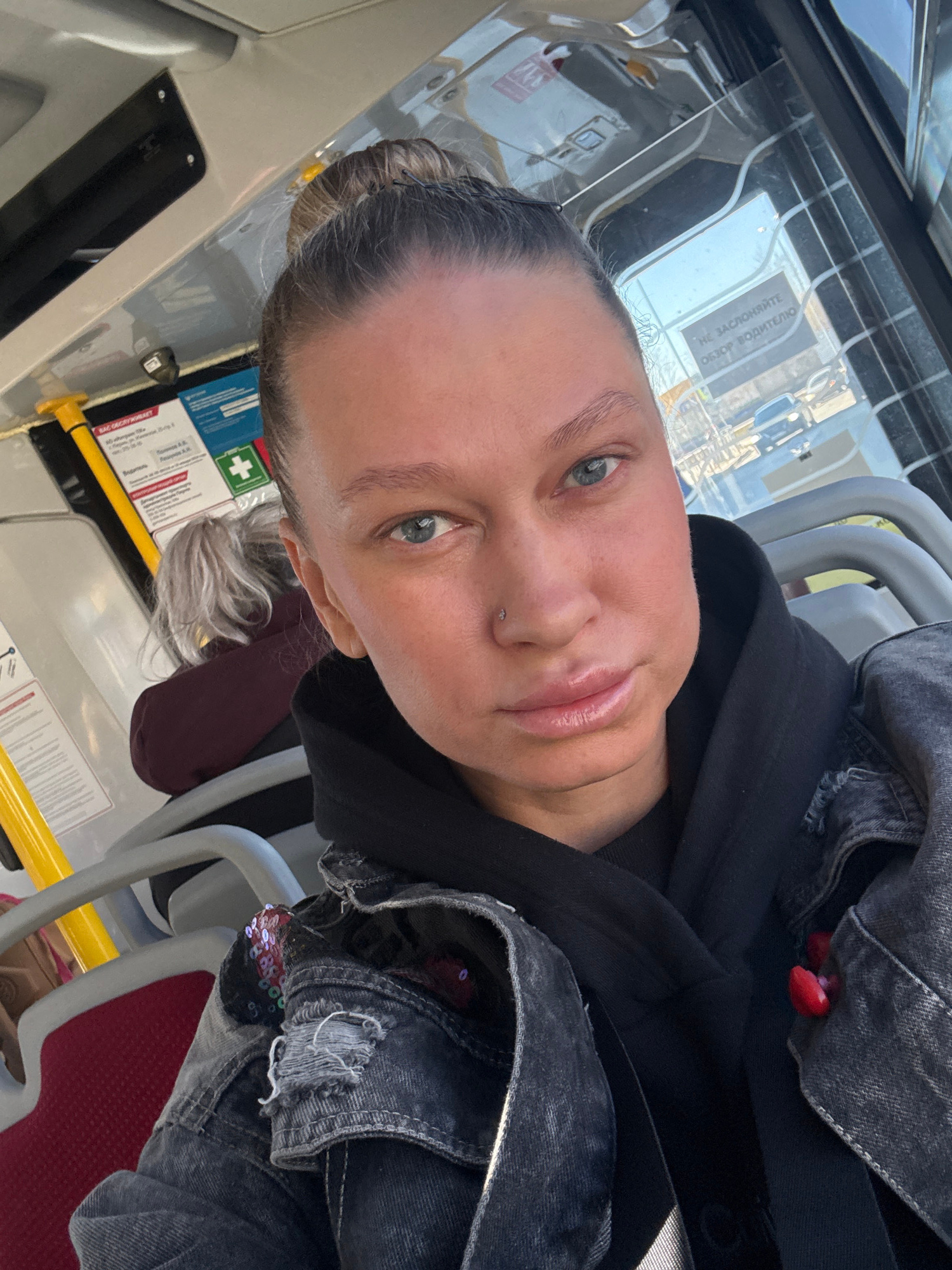 A person is seated on a bus in Perm, Russia, as evidenced by the Cyrillic lettering on the window and the emergency information card. The individual has light skin, blue eyes, and a nose piercing, wit…read more