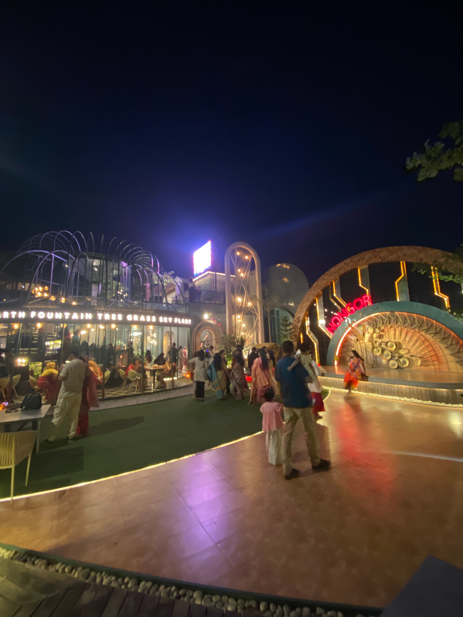 This outdoor scene, captured at night in Dhaka, Bangladesh, depicts a dining area. The architecture includes illuminated, multi-tiered structures. People are present throughout the scene, many appea…read more
