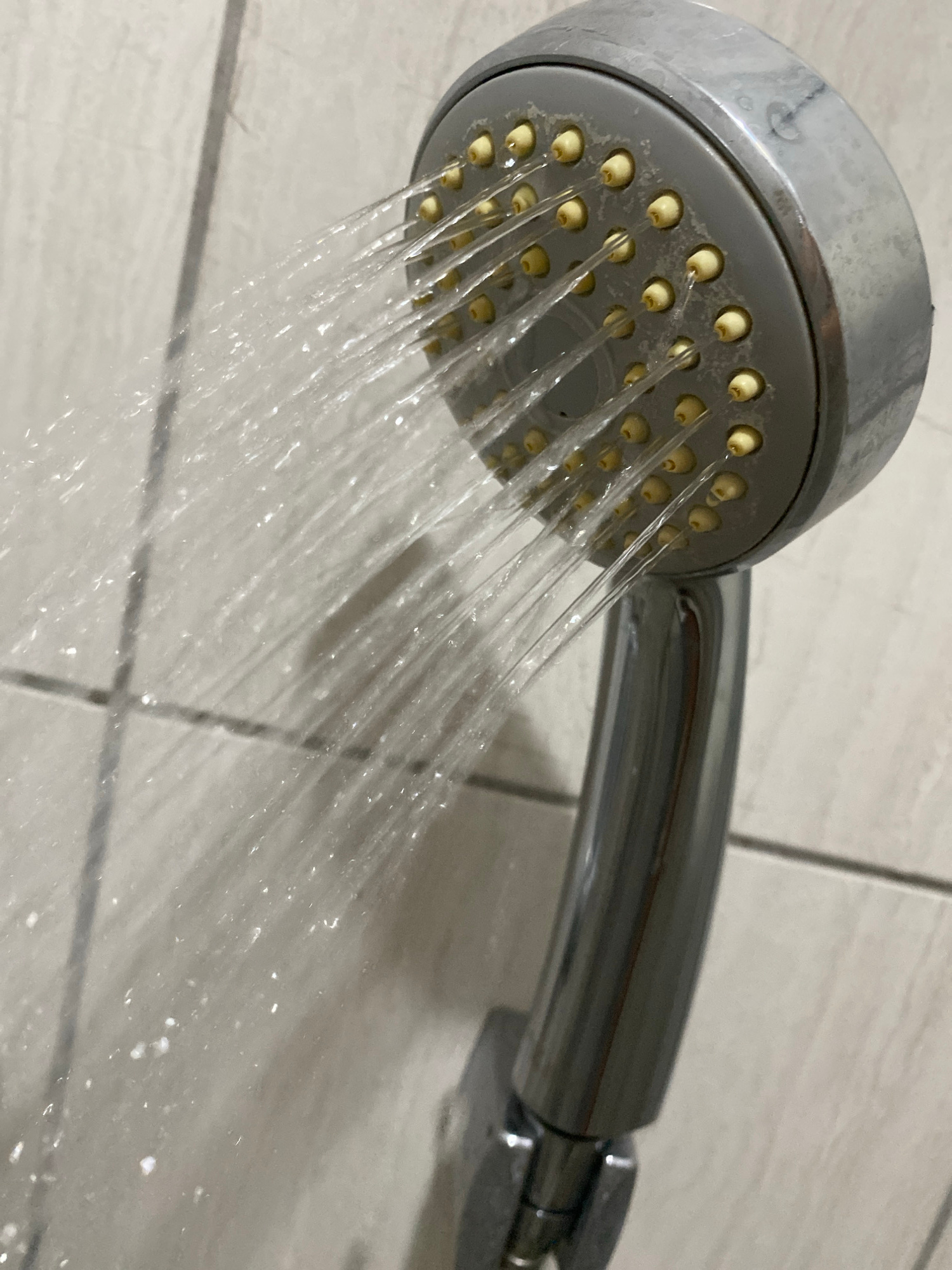 The image shows a shower head with water flowing out of it. The shower head is round and has several small nozzles. The water streams are clear and separate initially, then merge further down. The sho…read more