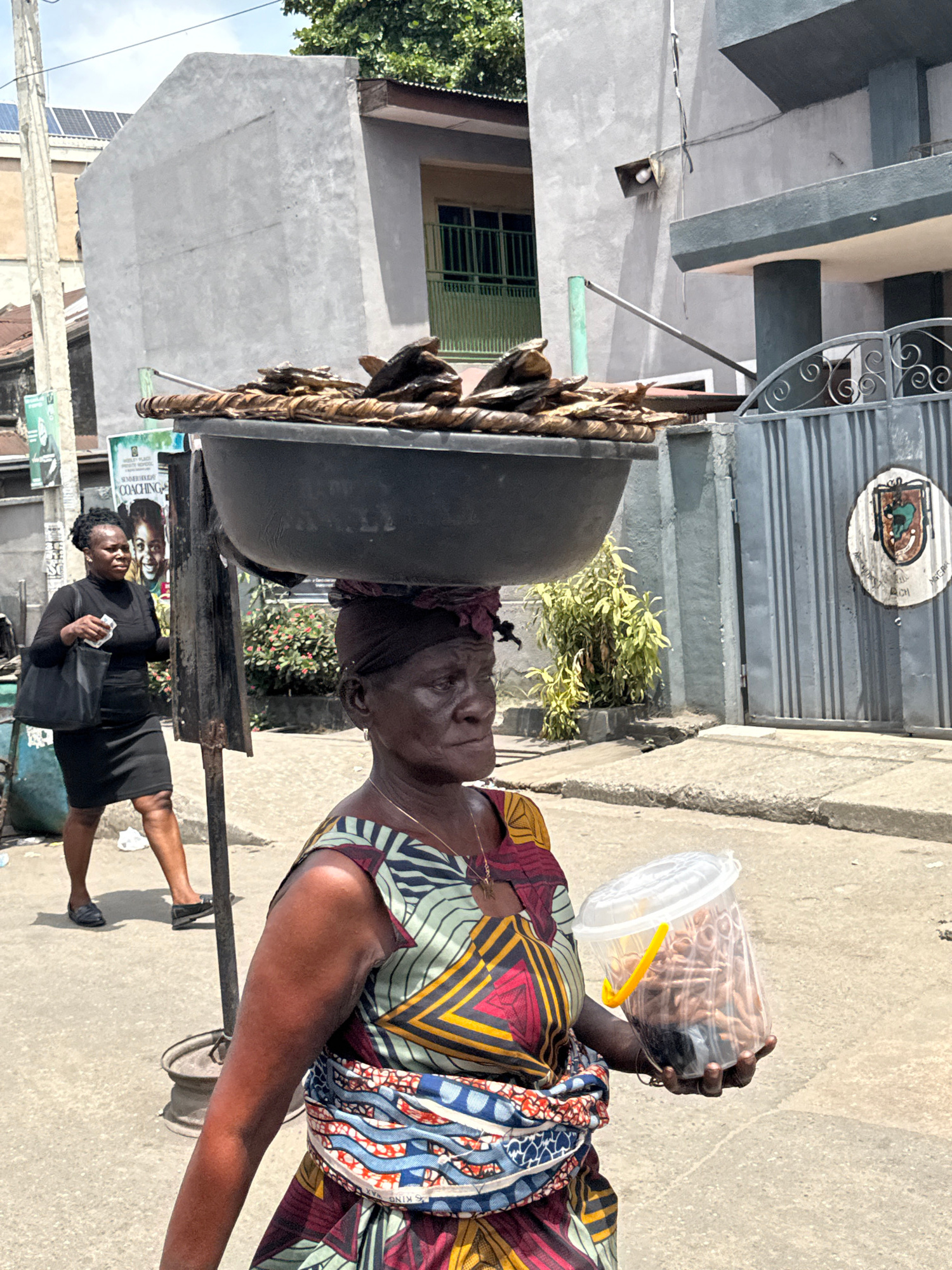 An elderly African woman in Lagos, Nigeria, carries a large bowl atop her head, likely filled with goods for sale, and a clear plastic container filled with snacks in her hand. She wears a colorful pa…read more