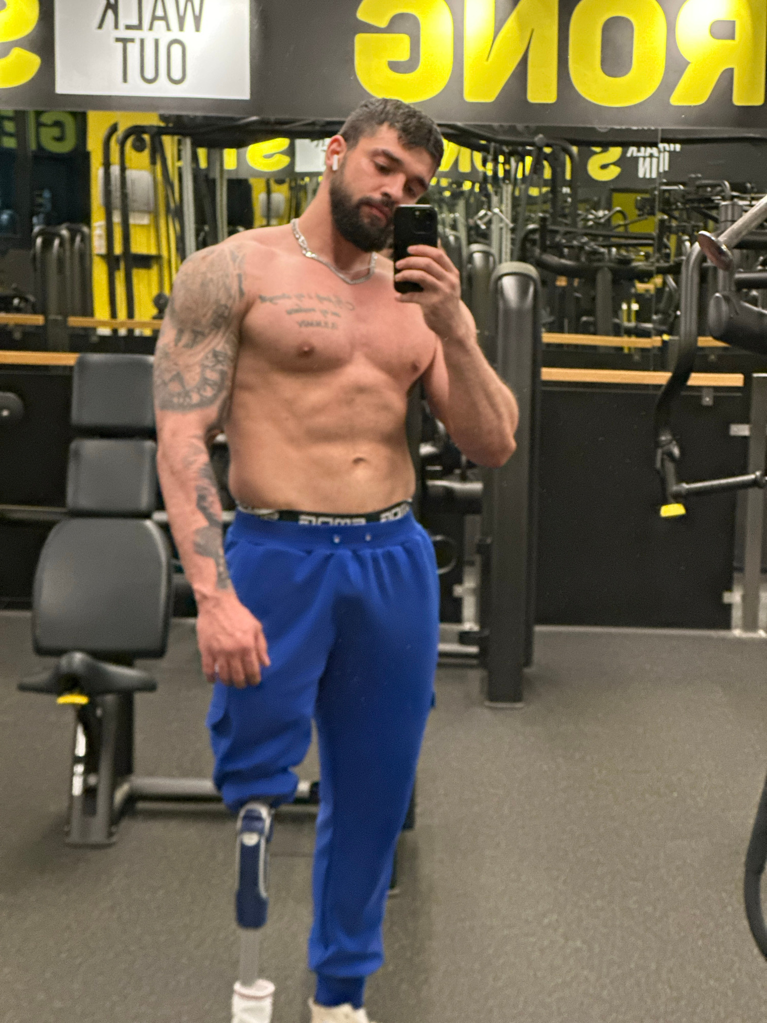 A muscular man with a beard, tattoos on his left arm, and a silver necklace is taking a selfie in a gym. He is shirtless, wearing blue sweatpants and white sneakers. He is standing in front of gym equ…read more