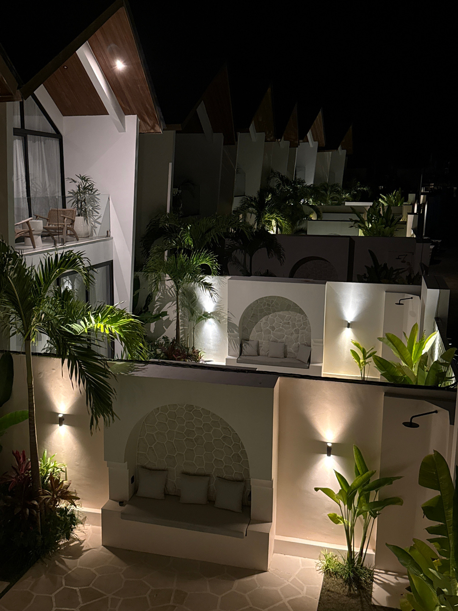 This media file captures a modern resort or hotel complex at night, located in Kuta Selatan, Indonesia. The scene is illuminated by warm, artificial lighting, highlighting architectural details and tr…read more