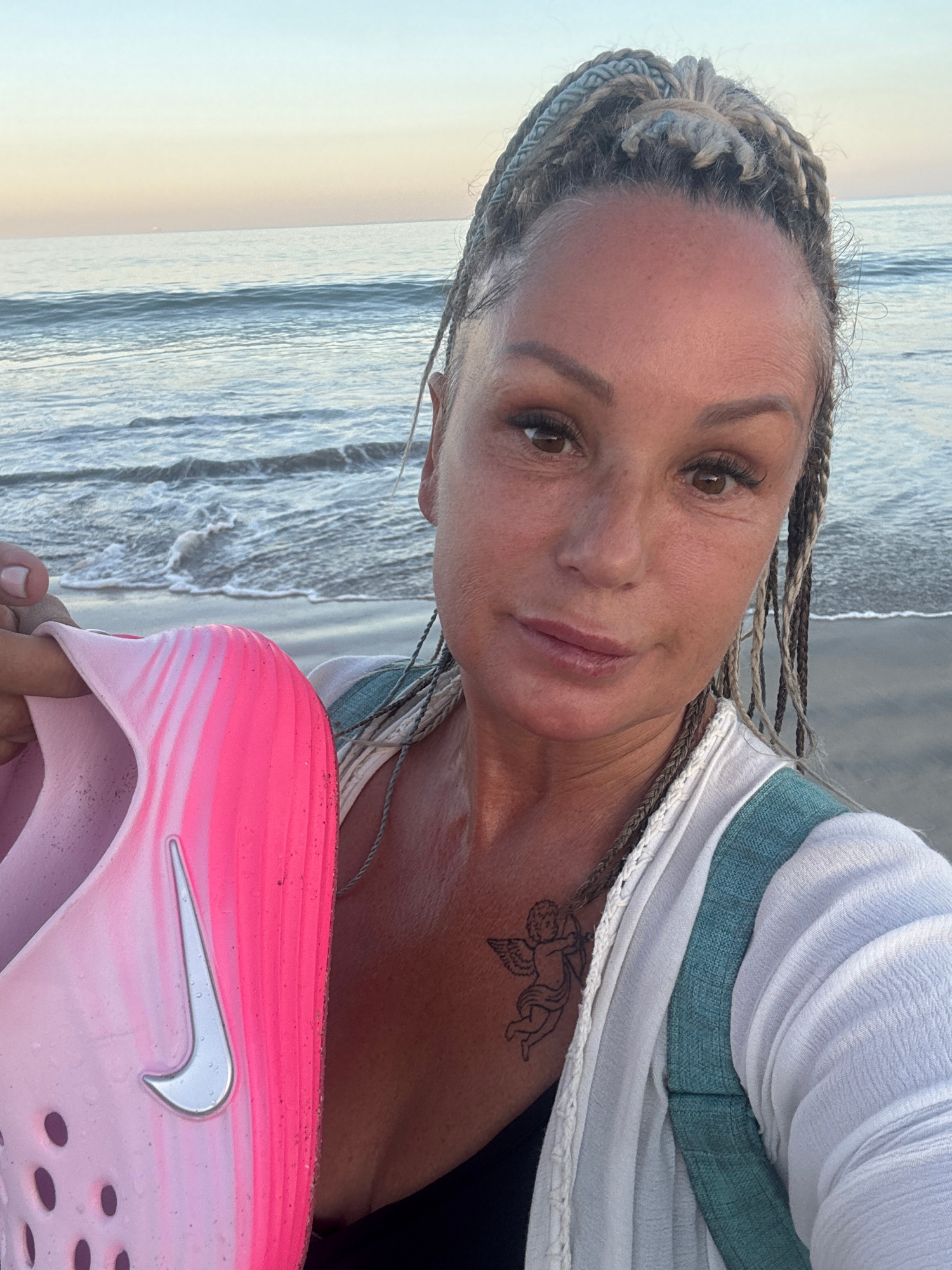 A woman takes a selfie on a beach in Kuta Selatan, Indonesia, with the ocean and sky forming the background. She has light-colored, possibly blonde or greyish, braids styled on her head and appears to…read more