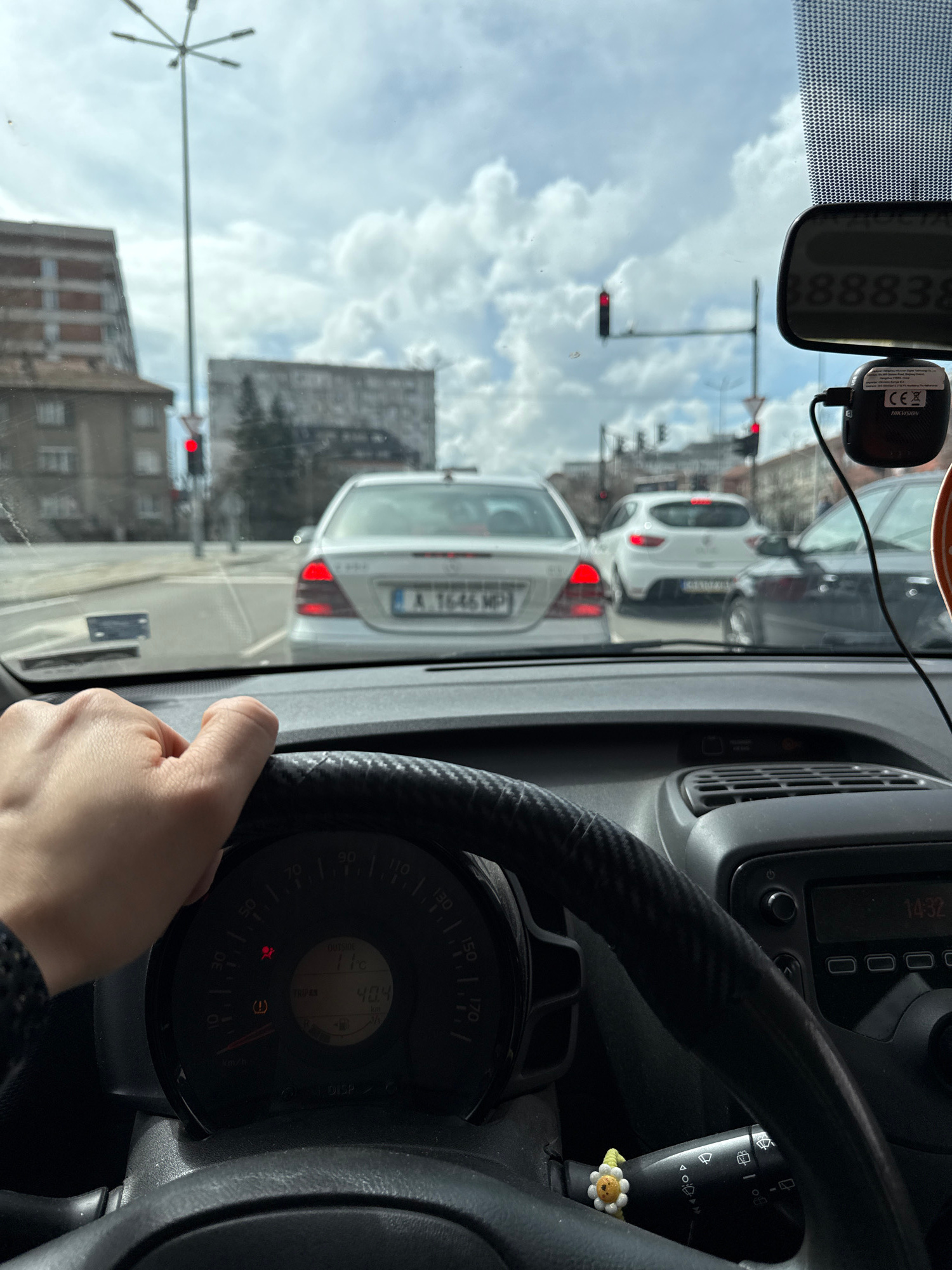 The image is taken from inside a car, specifically from the driver's perspective. A person's hand is visible holding the steering wheel. The dashboard and speedometer are in view, showing the outside…read more