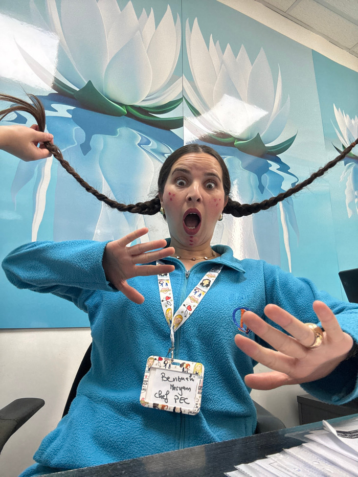 This image captures a woman seated in an indoor office environment, identified by her ID badge as "Benbach Meryam, Chef PEC," located in Meknes, Morocco. The woman, with dark hair styled into two long…read more