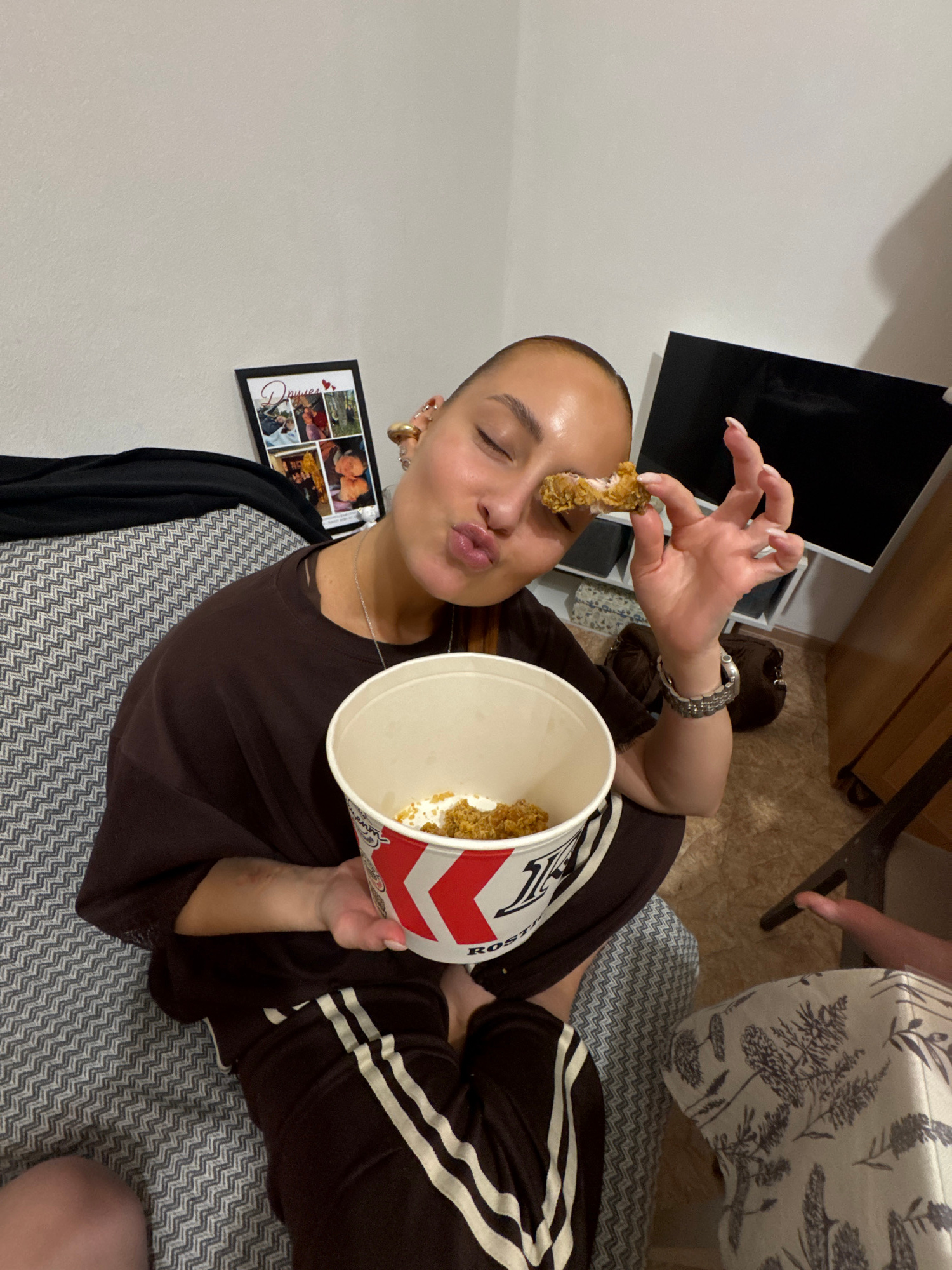 A woman is indoors, holding a piece of fried chicken near her face. She holds a bucket of fried chicken in her other hand. She is wearing a brown top and striped sweatpants, and sitting on a grey patt…read more