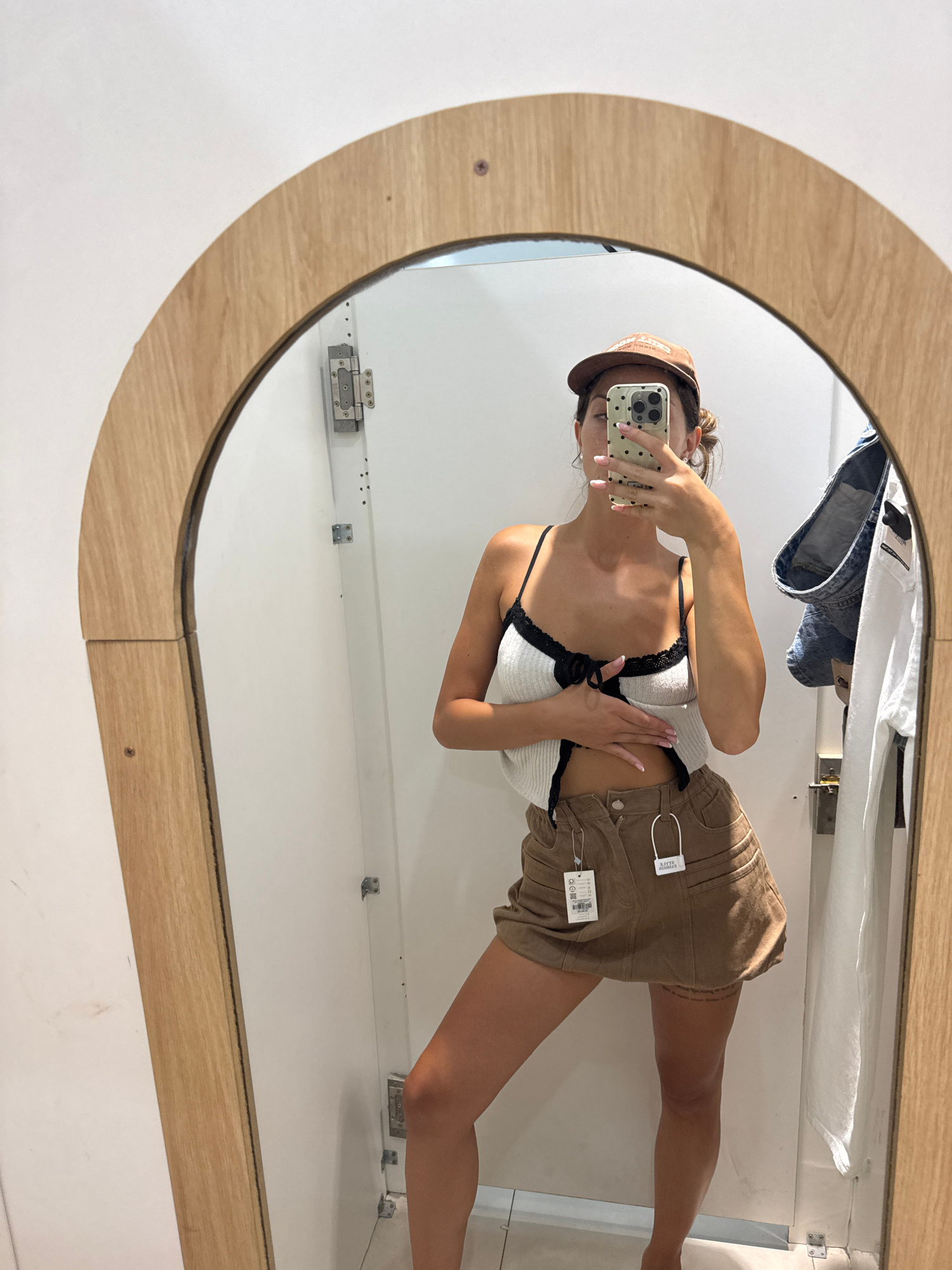 The image shows a young woman in a fitting room. She's wearing a white top with black trim, brown shorts with tags still attached, and a brown baseball cap. She is holding a cell phone with a polka do…read more