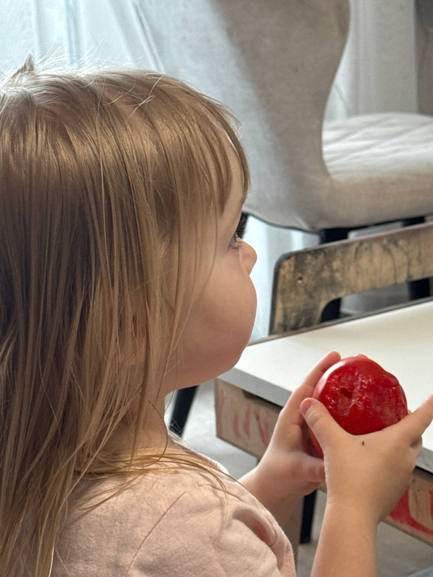 A young child with blonde hair looks up at a red object held in another child’s hands. The background includes a white chair and a wooden chair. The location and city are unknown.