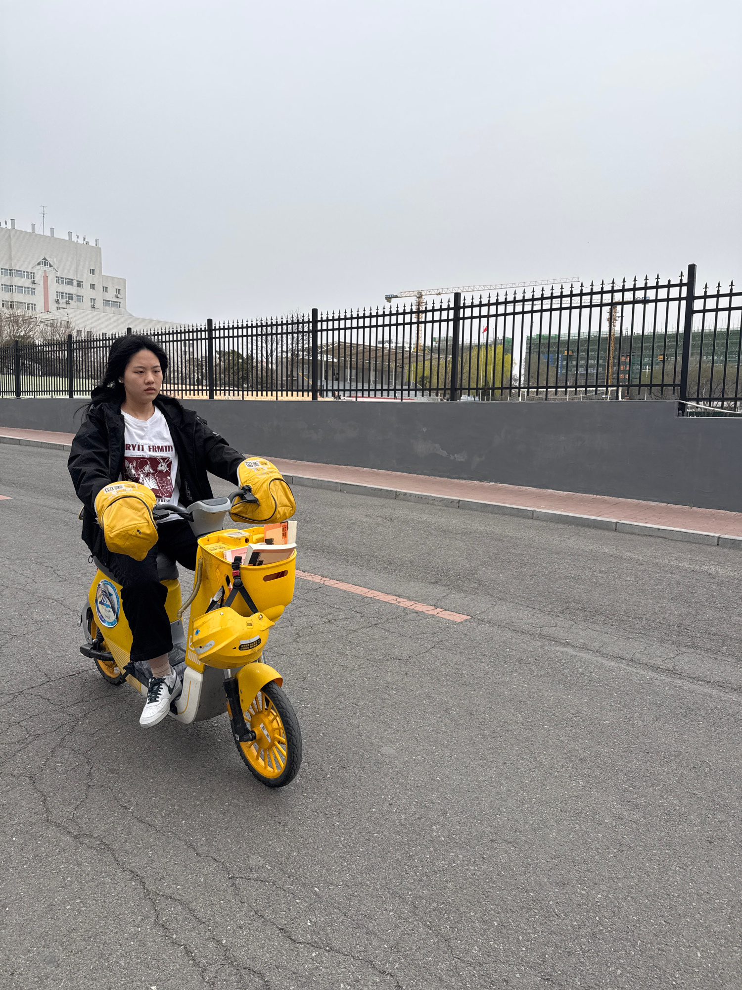 A person is sitting on a yellow bicycle in Zhongtun, China. The person is wearing a white t-shirt, black pants, and white sneakers. The bicycle is parked on an asphalt road. Behind the person and the…read more