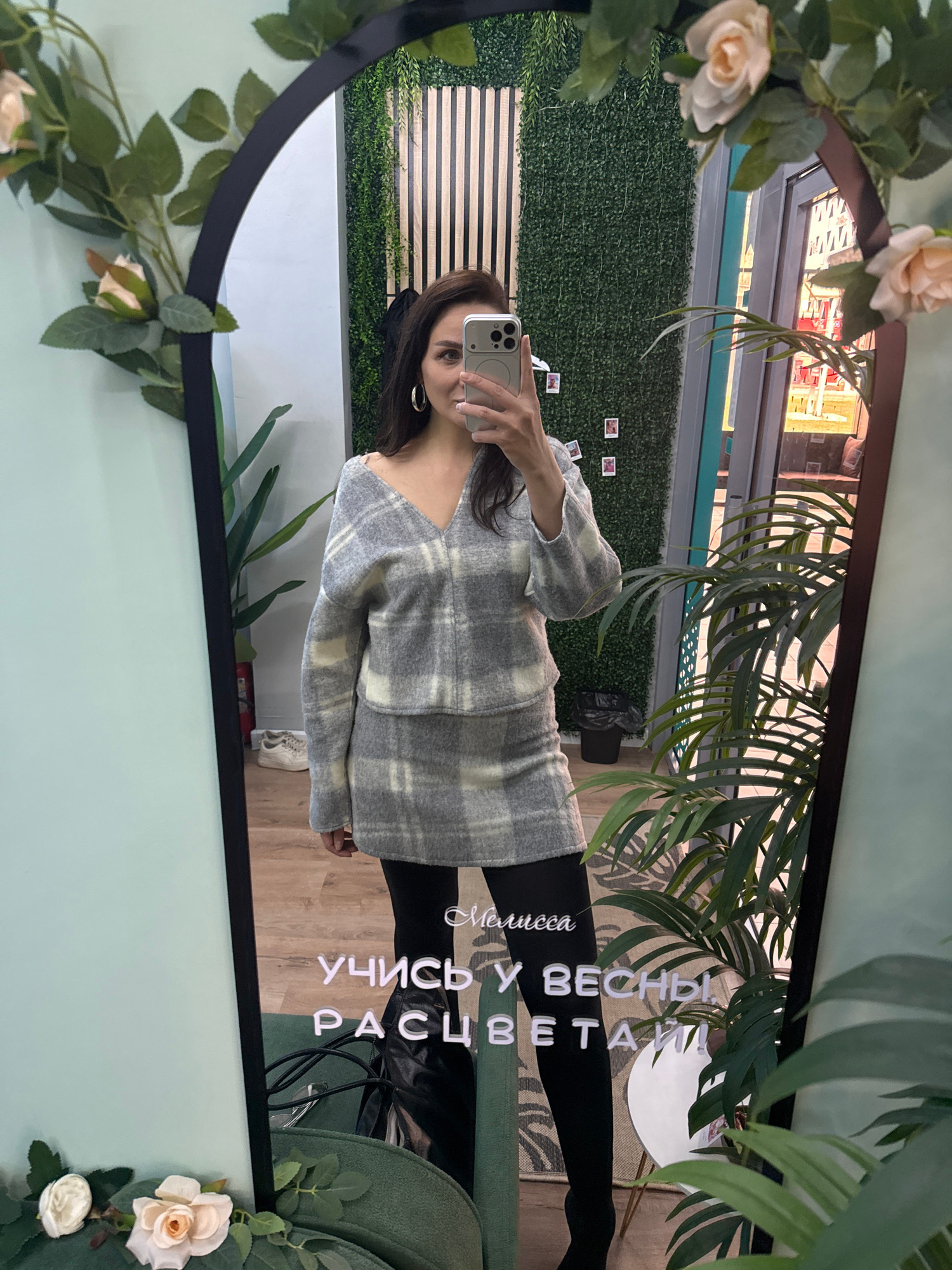 The image shows a person taking a mirror selfie. The person is wearing a grey and white plaid sweater and black leggings. The mirror is round and decorated with flowers and plants. The background of t…read more