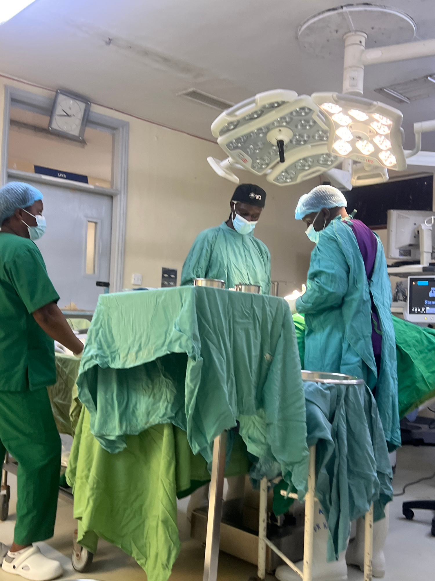 Three people wearing surgical scrubs and caps are visible in what appears to be an operating room. Two individuals are standing next to a surgical table draped in green cloth. A surgical light fixture…read more