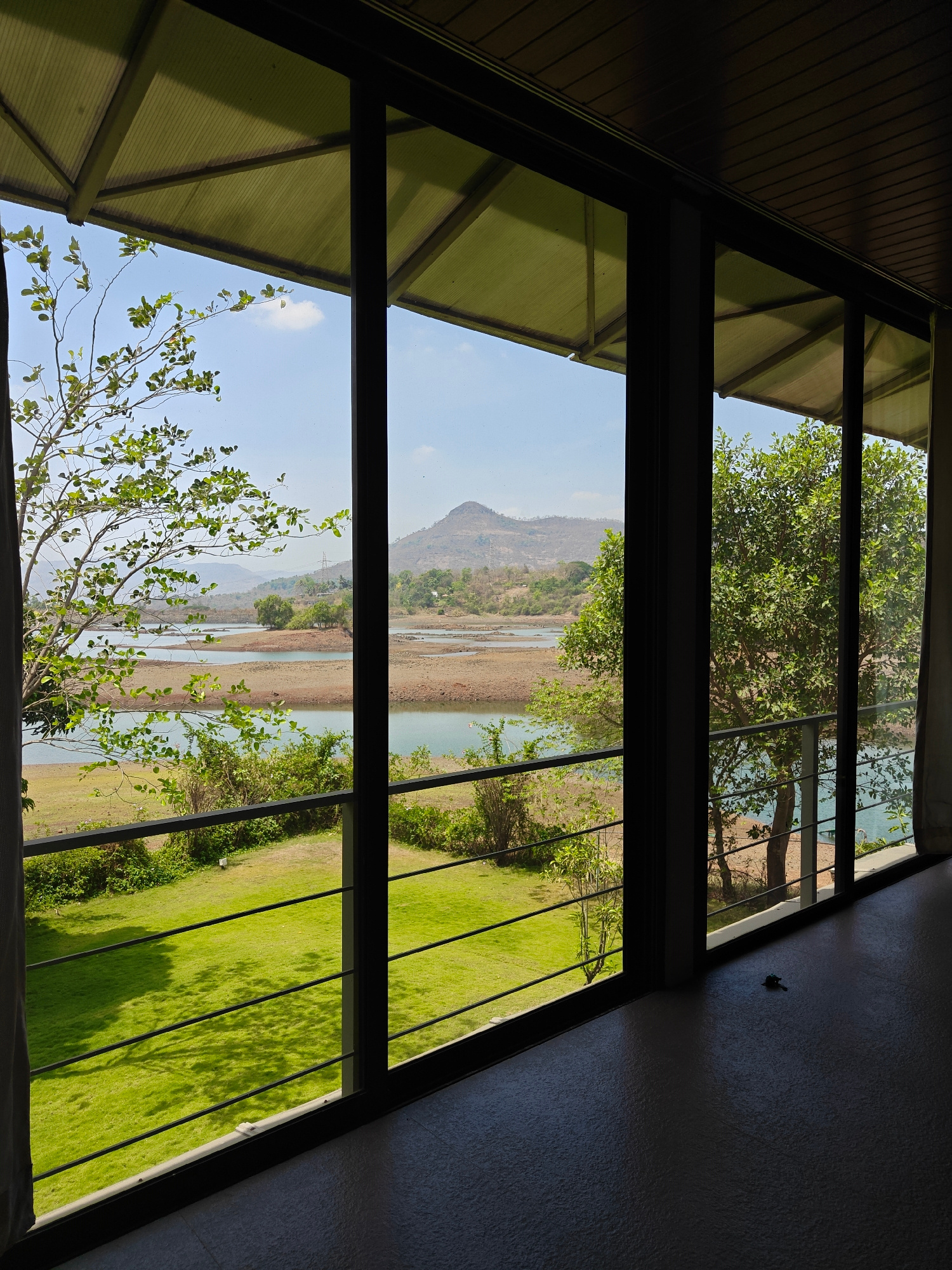 The image depicts an interior view through a large glass window or sliding door, looking out onto a landscape near Kalote Mokashi, India. The view is dominated by a body of water, possibly a lake or r…read more