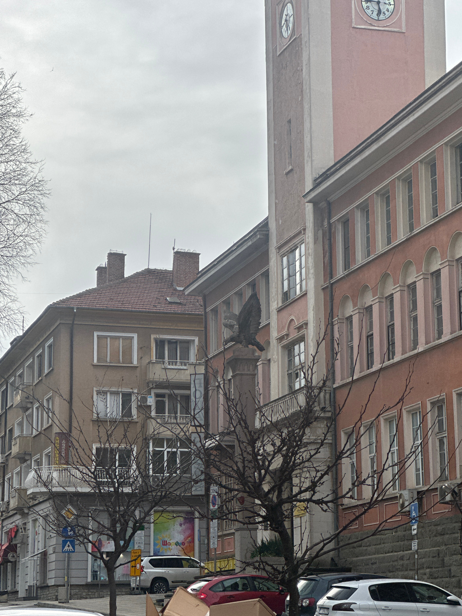The image shows a street scene in Stara Zagora, Bulgaria. The street is lined with buildings of varying heights and architectural styles, including a building with a clock tower, and another with a st…read more