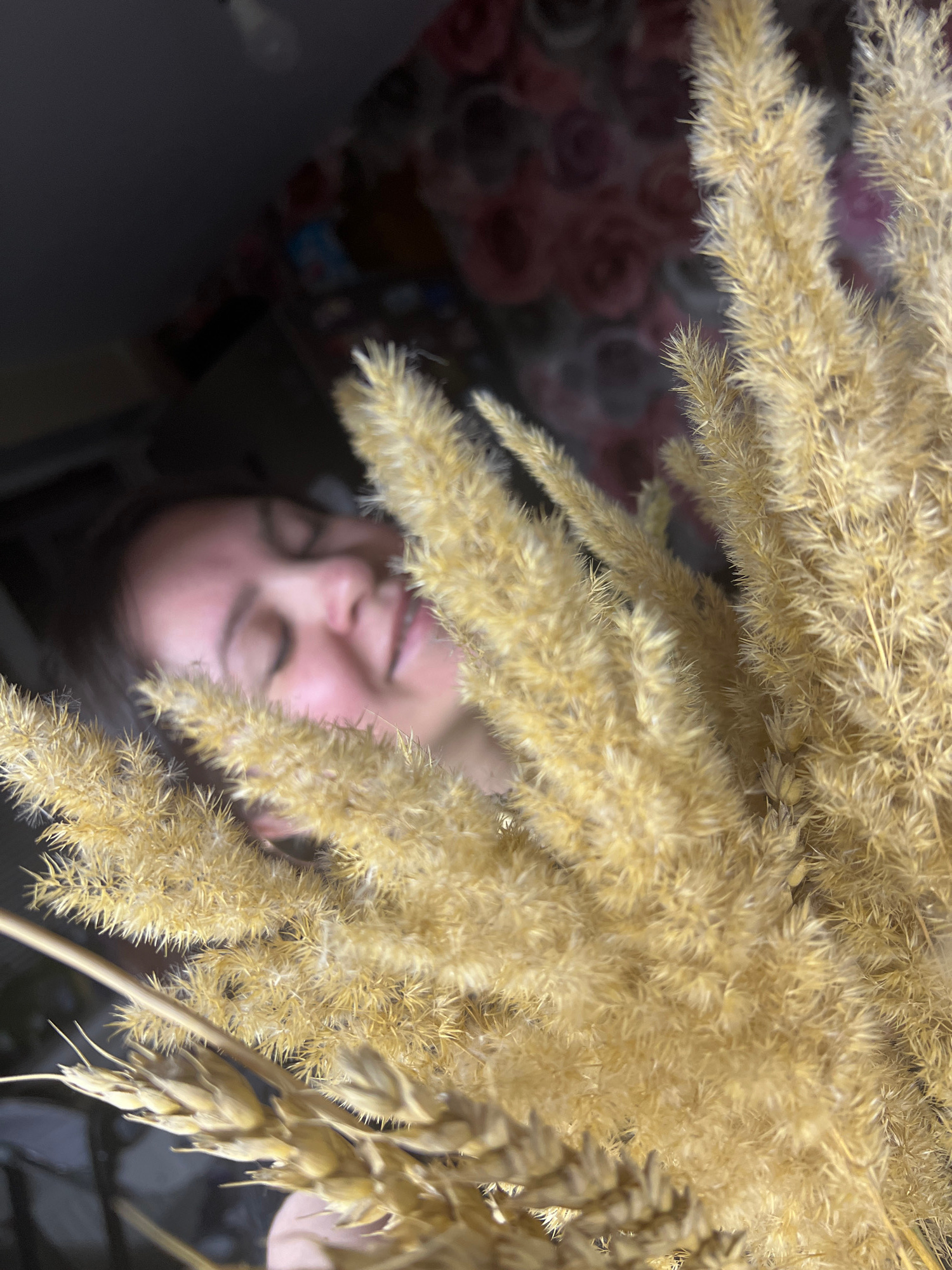A close-up, tilted shot reveals a person's face partially obscured by stalks of wheat or similar dried grasses. The person has closed eyes and appears relaxed. The foreground is dominated by the yello…read more