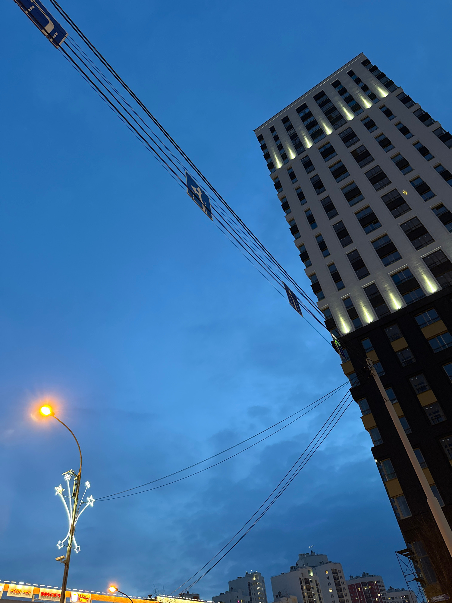 The image shows a low-angle view of a building in Yekaterinburg, Russia at dusk. The building is tall, white, and modern with many windows. A portion of the building is black. Electrical lines stretchβ¦read more