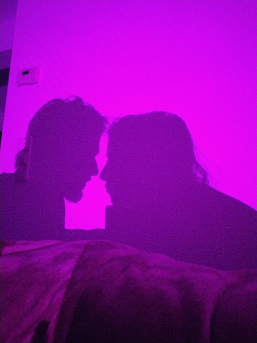 A purple-toned image displays two shadowy face profiles. The top face faces right, while the bottom face faces left, creating a kissing silhouette. The right side shows a body outline, possibly wearin…read more