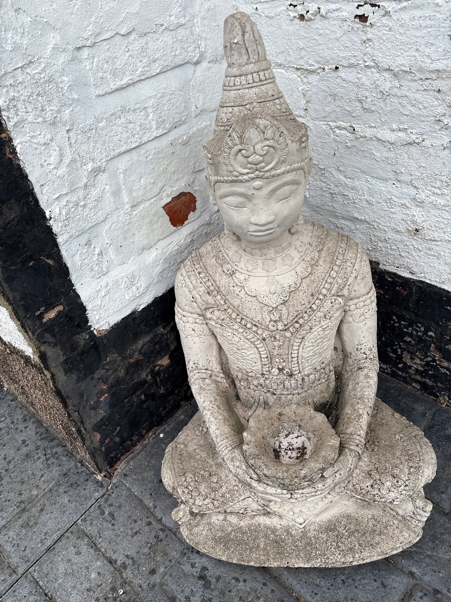 The image captures a weathered, light-colored stone statue, likely depicting a Buddha or a similar deity, positioned outdoors in Minsterley, United Kingdom. The statue is viewed from a high angle, app…read more