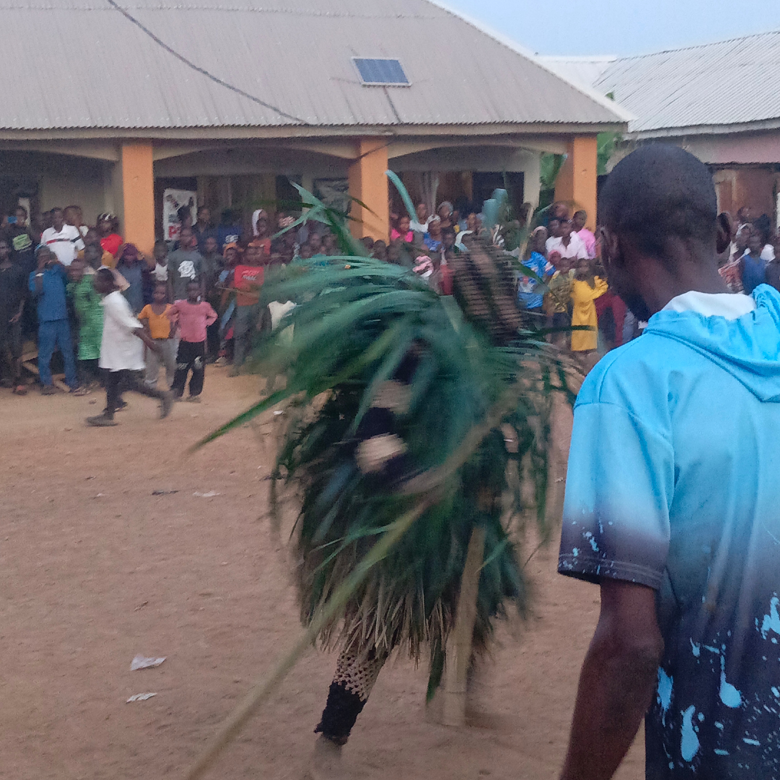 In an outdoor setting, possibly a courtyard or open area in the city of Unknown, Unknown, a scene unfolds involving numerous people and a peculiar figure. A crowd of individuals, predominantly childr…read more
