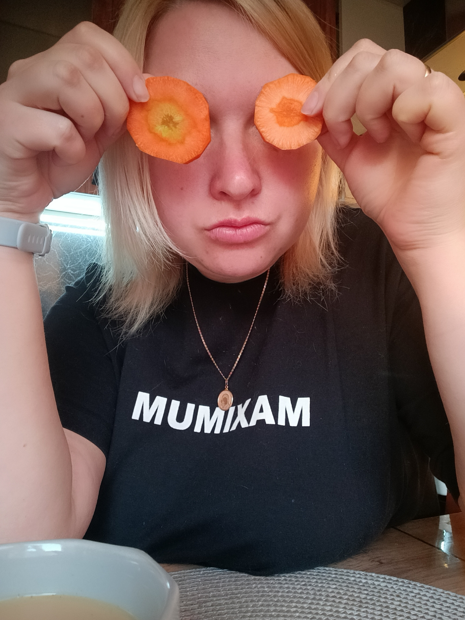 A woman with blonde hair is holding two slices of carrot over her eyes, obscuring them. She wears a black t-shirt with "MUMIXAM" in white letters. A gold necklace with a pendant hangs around her neck.…read more
