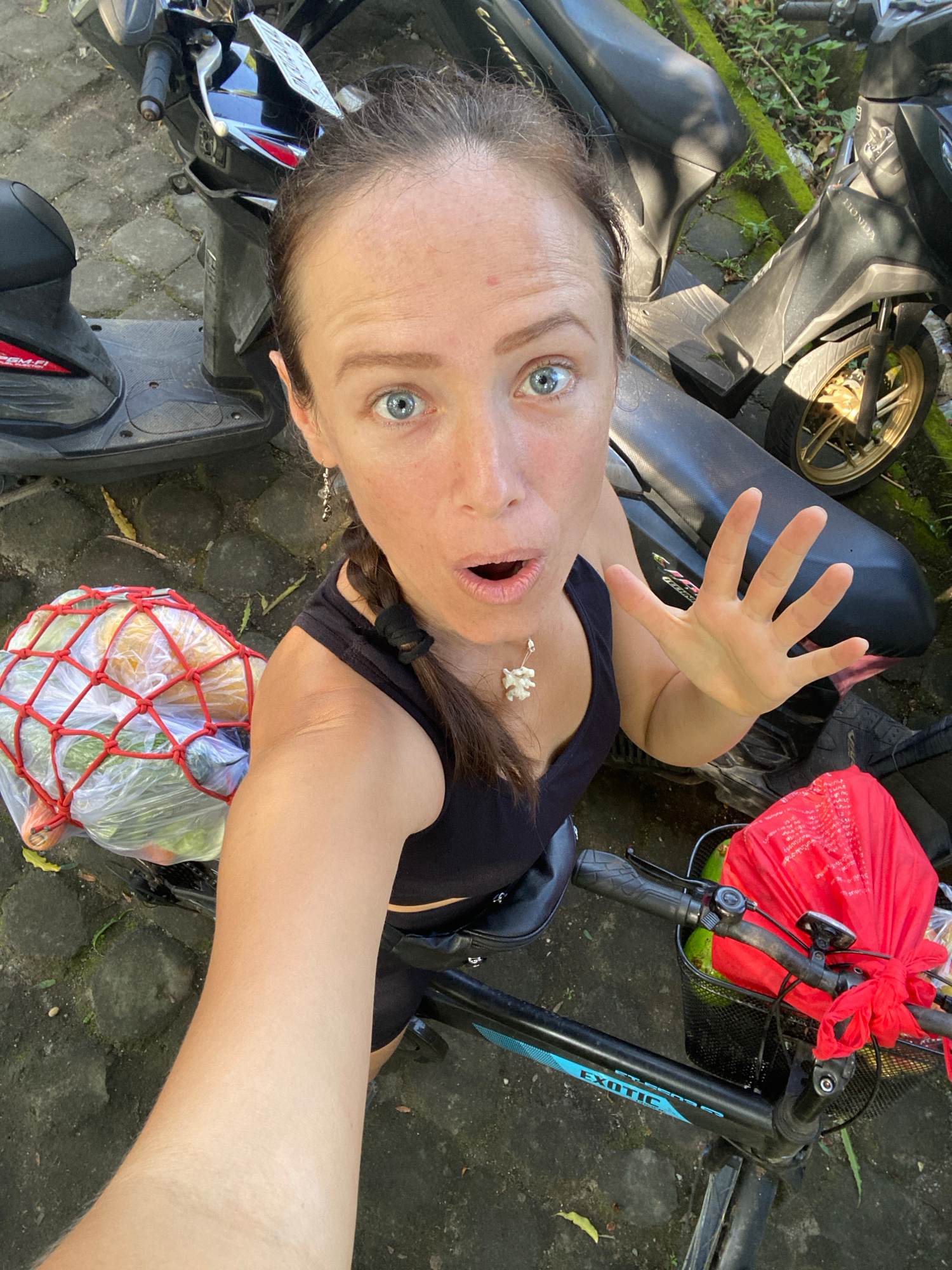 A fair-skinned woman with blue eyes is taking a selfie from a high angle. She has a surprised expression, with her mouth open and her left hand raised, palm facing forward. She's wearing a black top a…read more