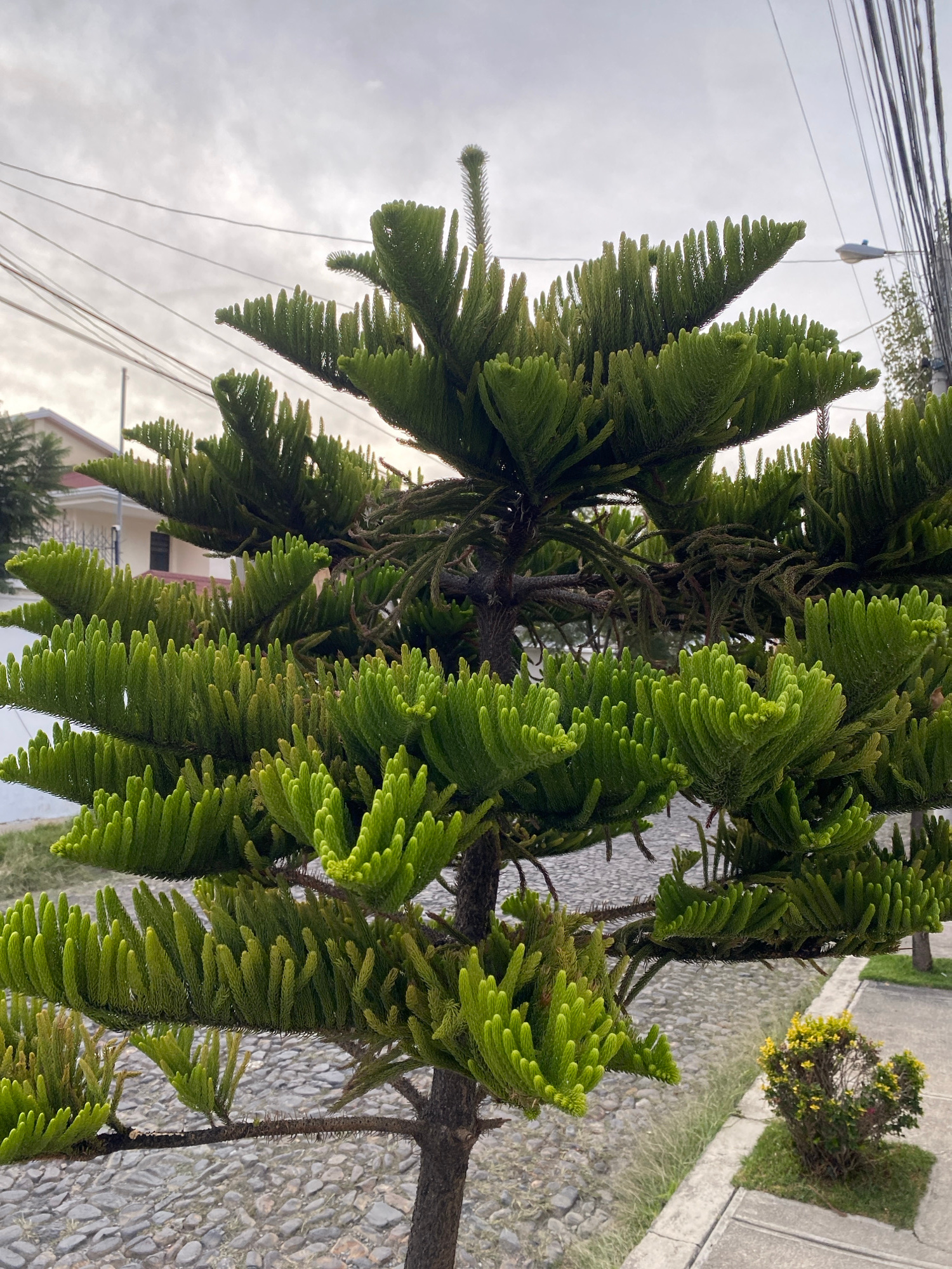 A vibrant green conifer tree, possibly a Norfolk Island Pine, dominates the scene, its distinctive layered branches covered in dense, light green, scale-like needles. The tree's foliage appears soft a…read more