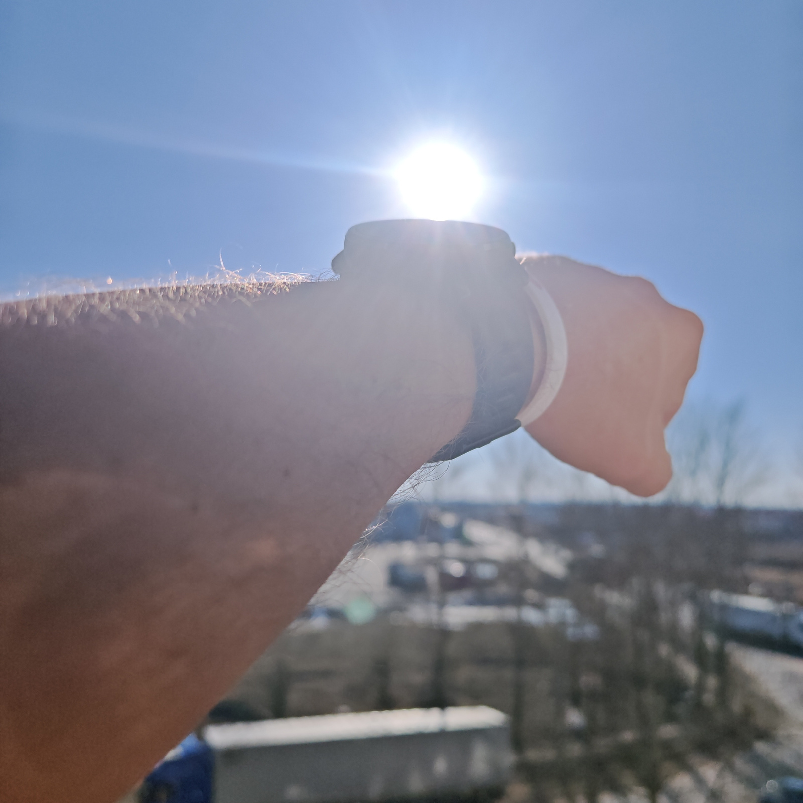 A person's arm is extended towards the bright sun in a blue sky. A wristwatch with a dark band and a light-colored band underneath is on their wrist. The background is blurry, showing what appears to…read more