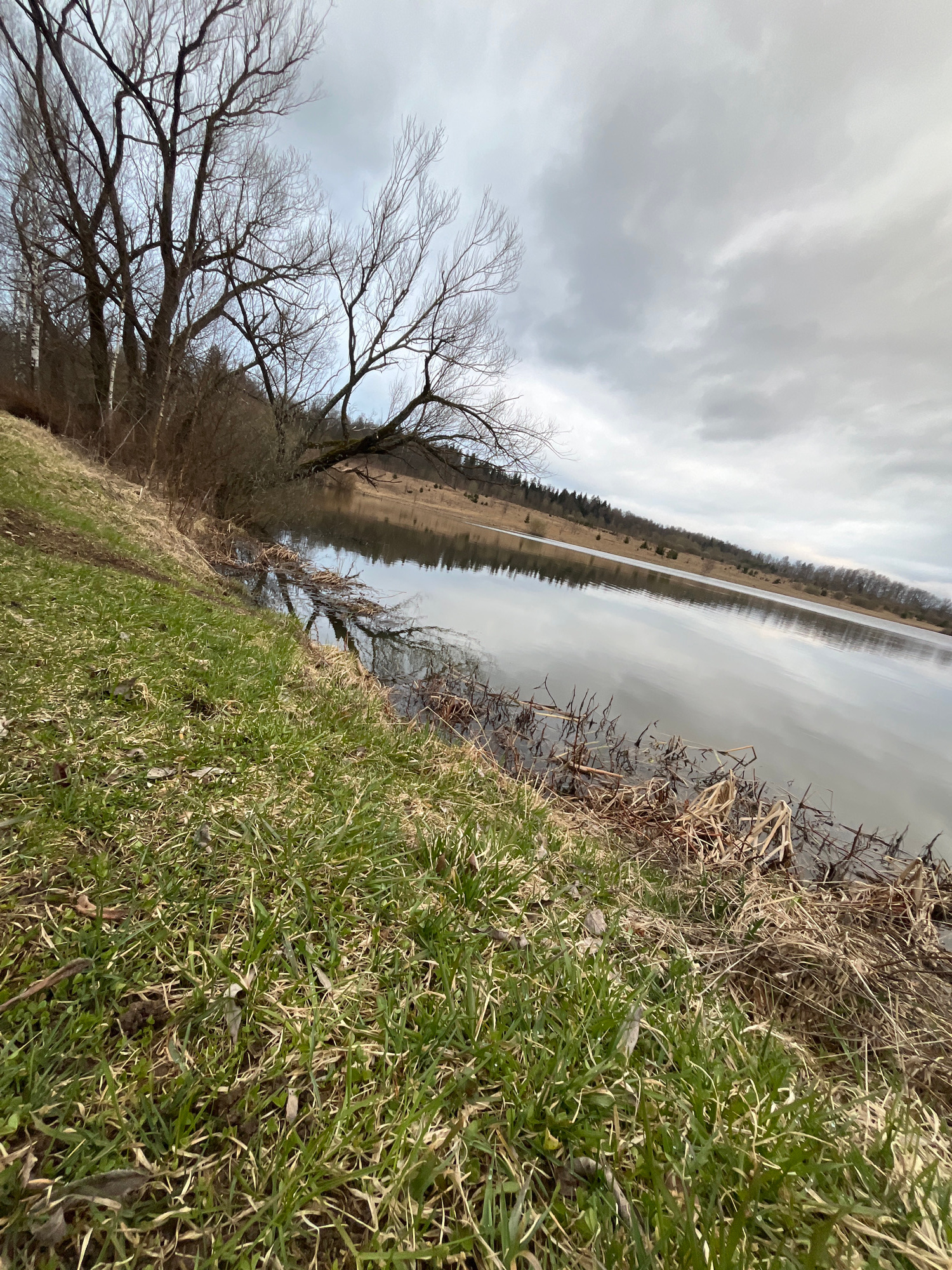 The image shows a landscape with a river or lake reflecting a cloudy sky. On the left side of the water, there are bare trees and vegetation along the bank. On the right side, there's grassy vegetatio…read more