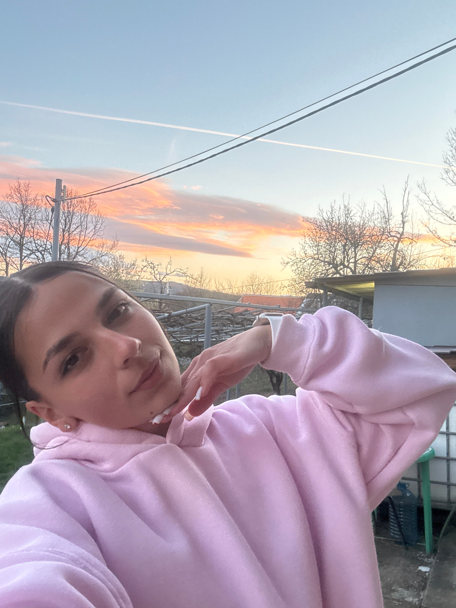The image shows a young woman in a pink hoodie. She is facing the camera with her hand near her chin. In the background, there is a sunset sky with orange and yellow hues. Power lines and bare tree br…read more