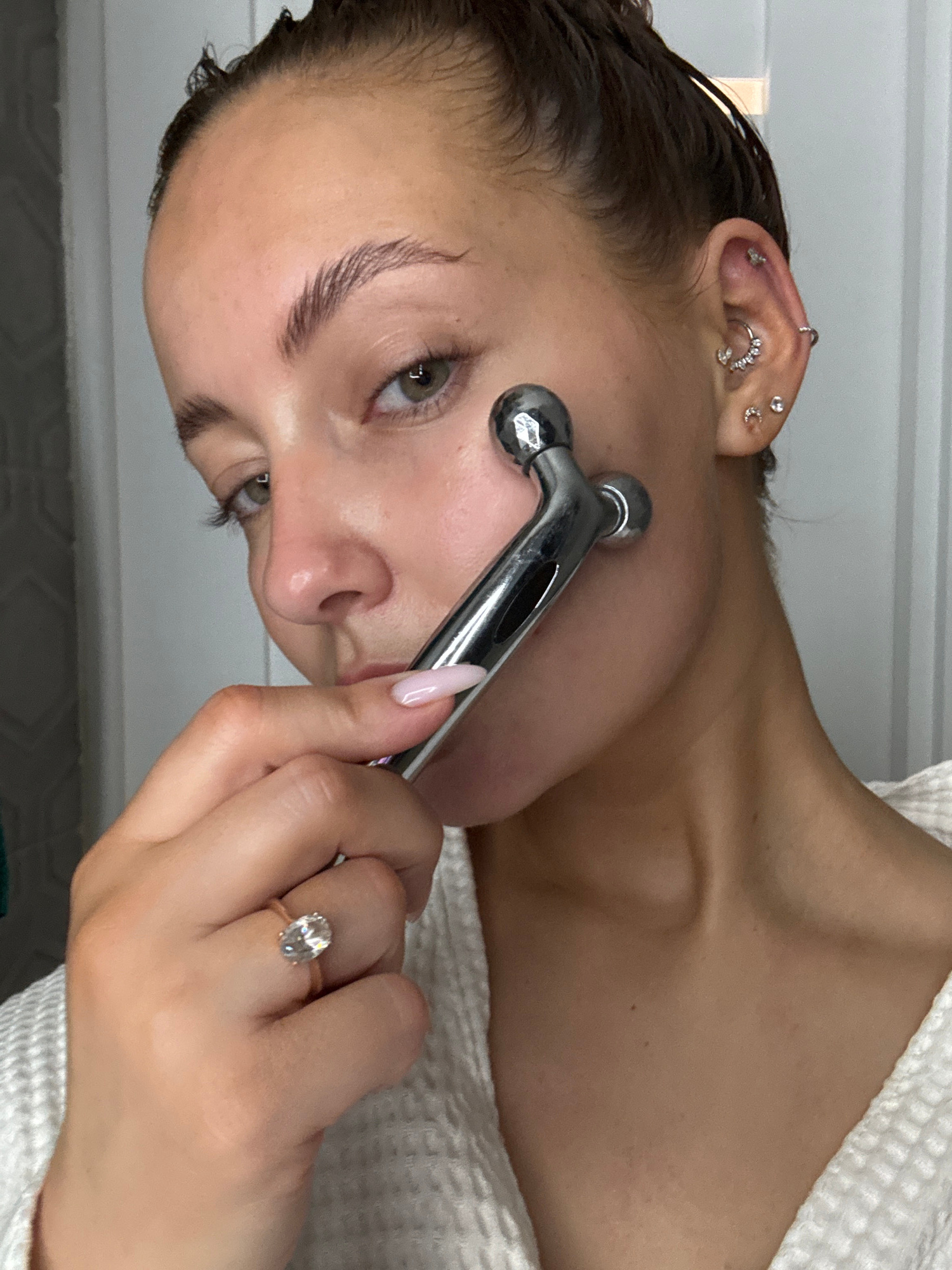 A woman is using a facial massager on her cheek. She is wearing a white robe and has several ear piercings. She is also wearing a ring on her finger. The location cannot be determined as Chaikovsky, R…read more