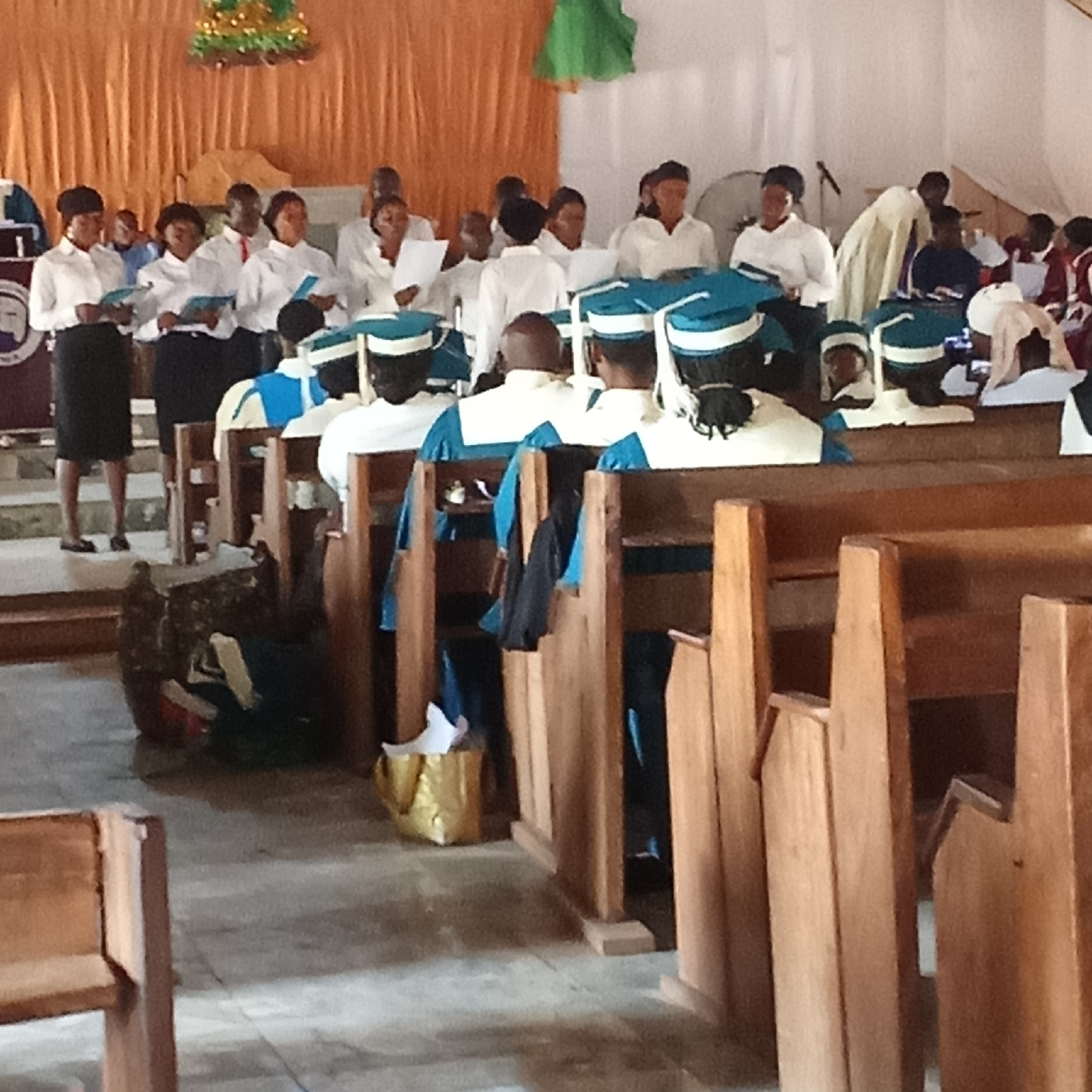 A photograph depicts a church choir in Akwanga, Nigeria. The choir is divided into two sections, one standing and one seated. The standing members, predominantly women, are dressed in white shirts and…read more