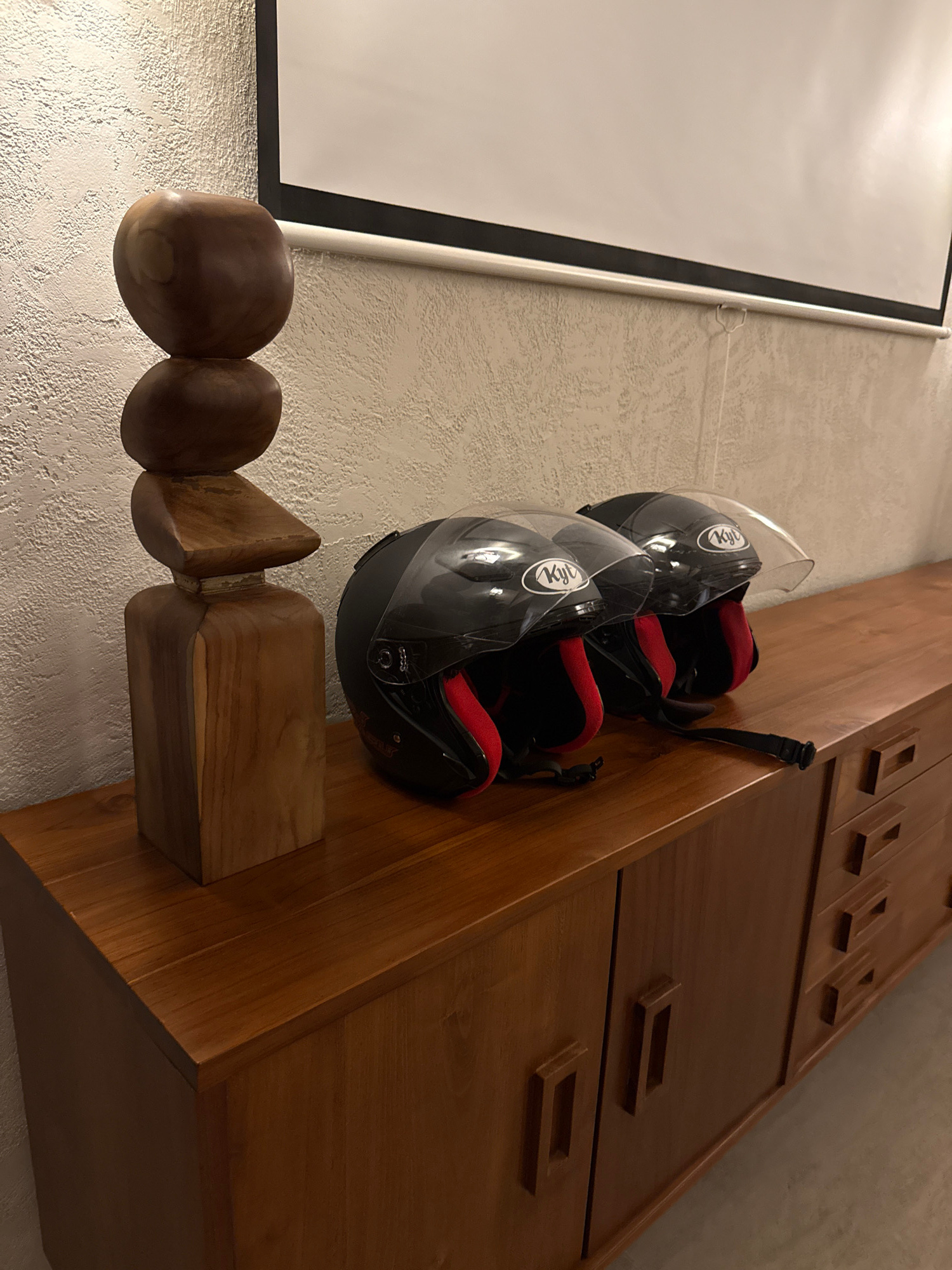 The image shows two black and red KYT motorcycle helmets hanging on a wooden rack that is mounted on a wooden cabinet. The helmets have clear visors. The rack is composed of rounded and rectangular wo…read more