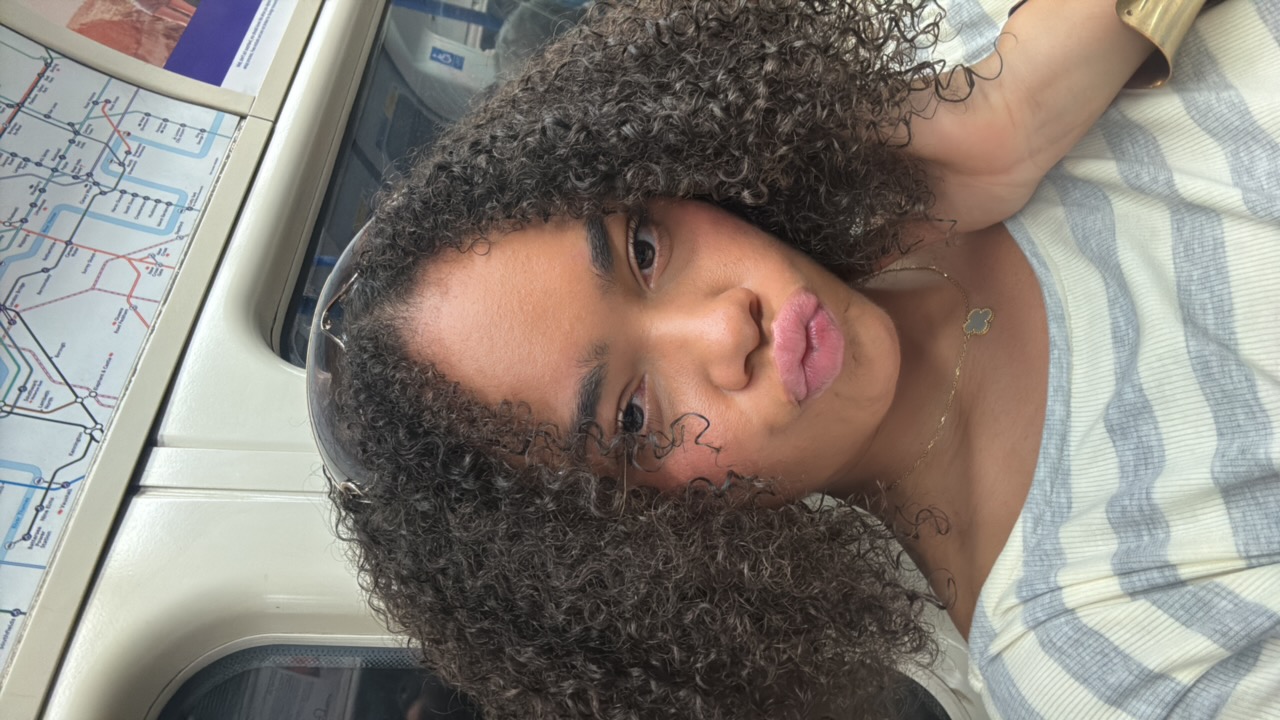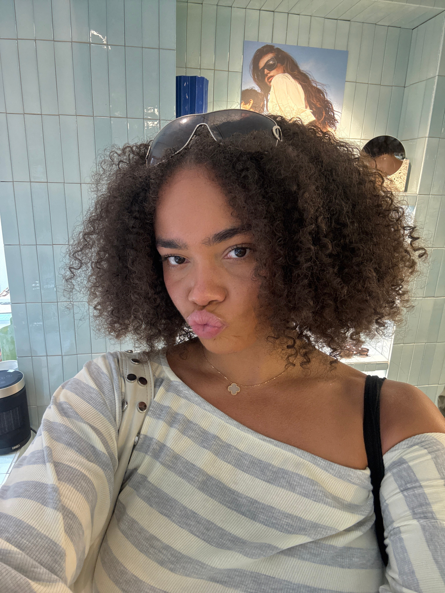 A woman with dark curly hair and sunglasses atop her head is posing for a selfie. She is wearing a striped shirt with a black bra strap visible, and a gold necklace. The background features light blue…read more