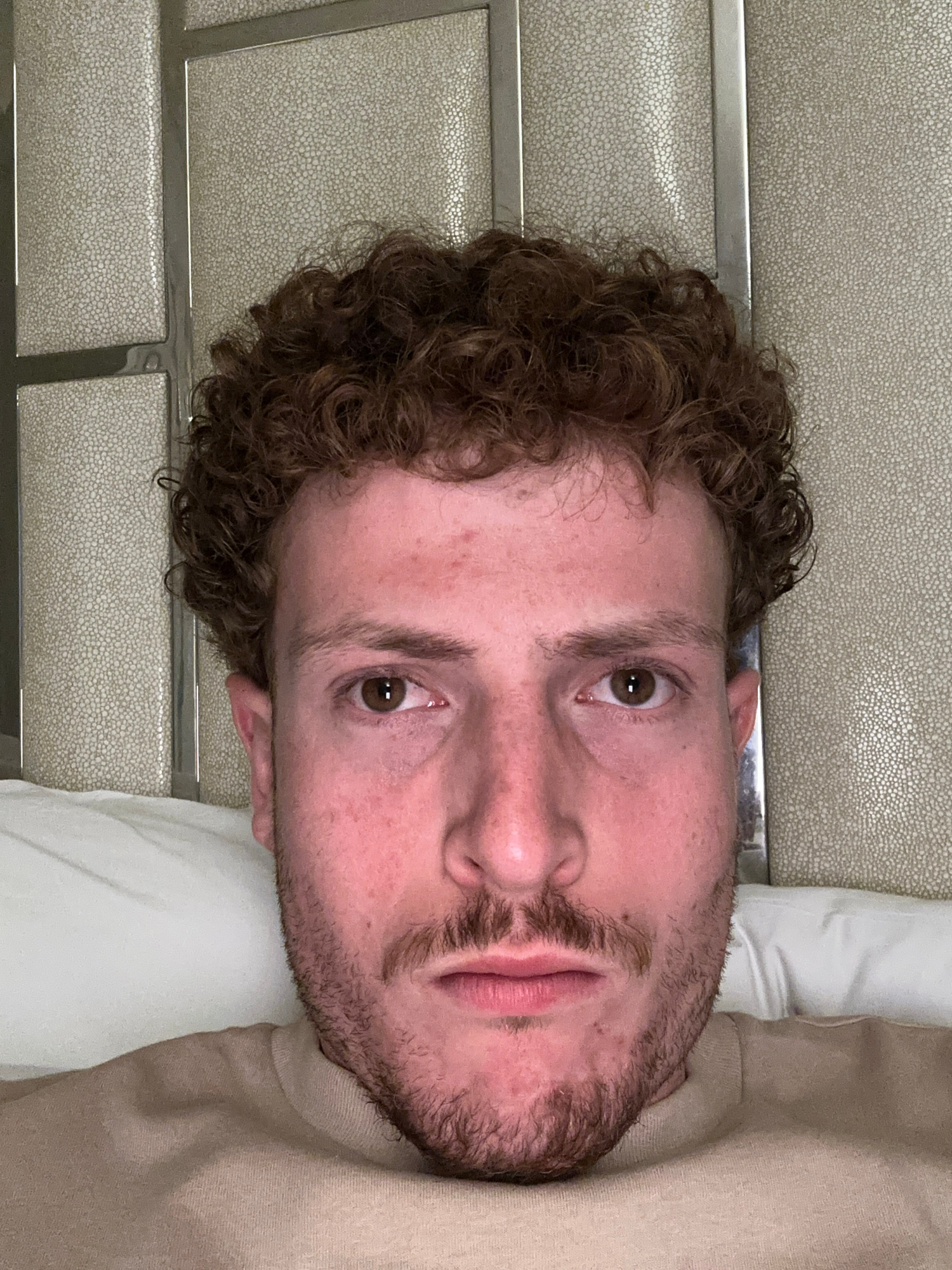 A close-up, slightly angled view shows a person's face. The individual has curly brown hair and a short beard. Their eyes are brown, and they appear to be looking directly at the camera. The person is…read more