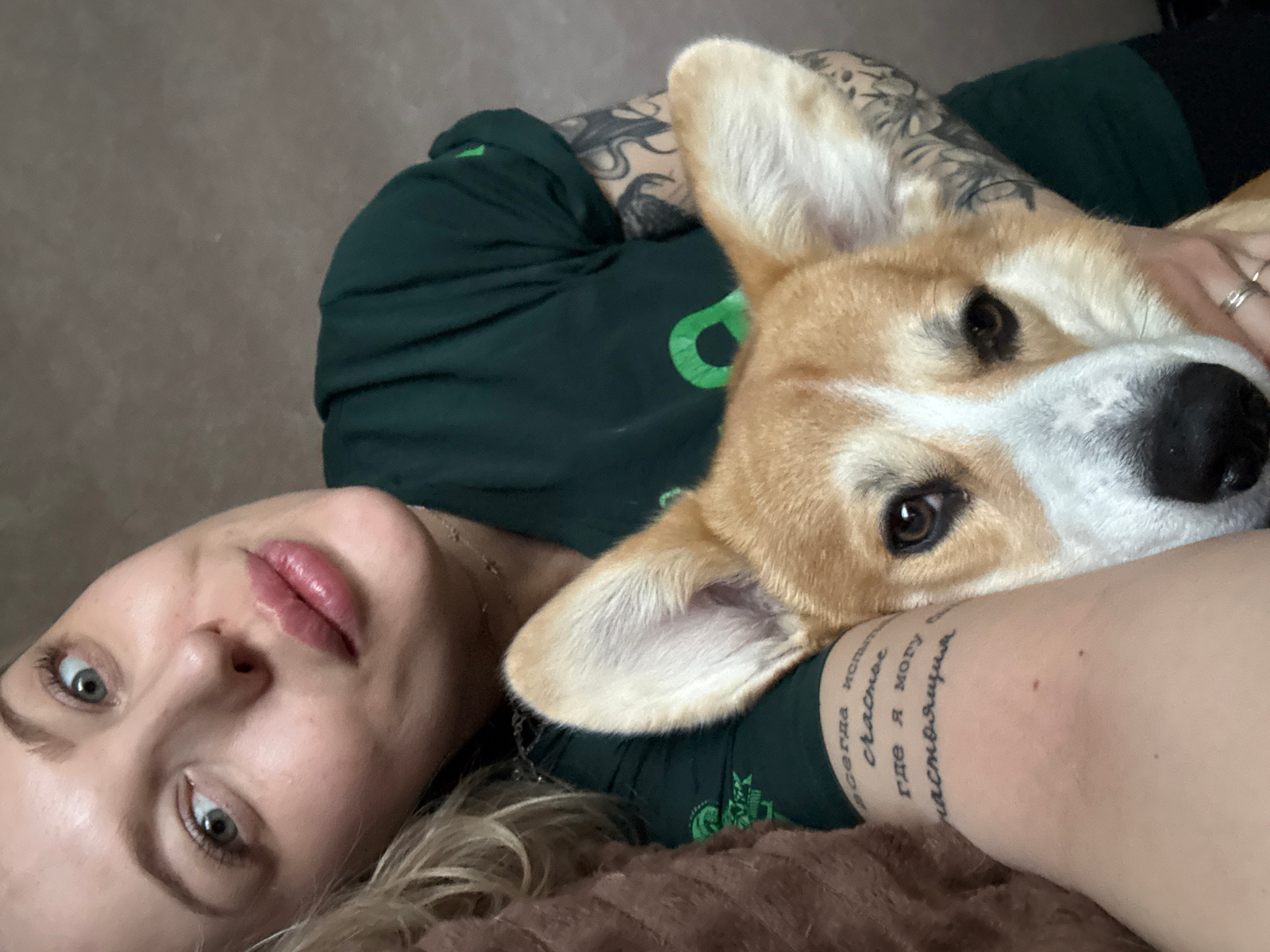 A woman with light skin and blonde hair lies on a brown surface, with a corgi dog nestled on her arm. The dog has a brown and white coat. The woman wears a dark green t-shirt with a green graphic. Tat…read more