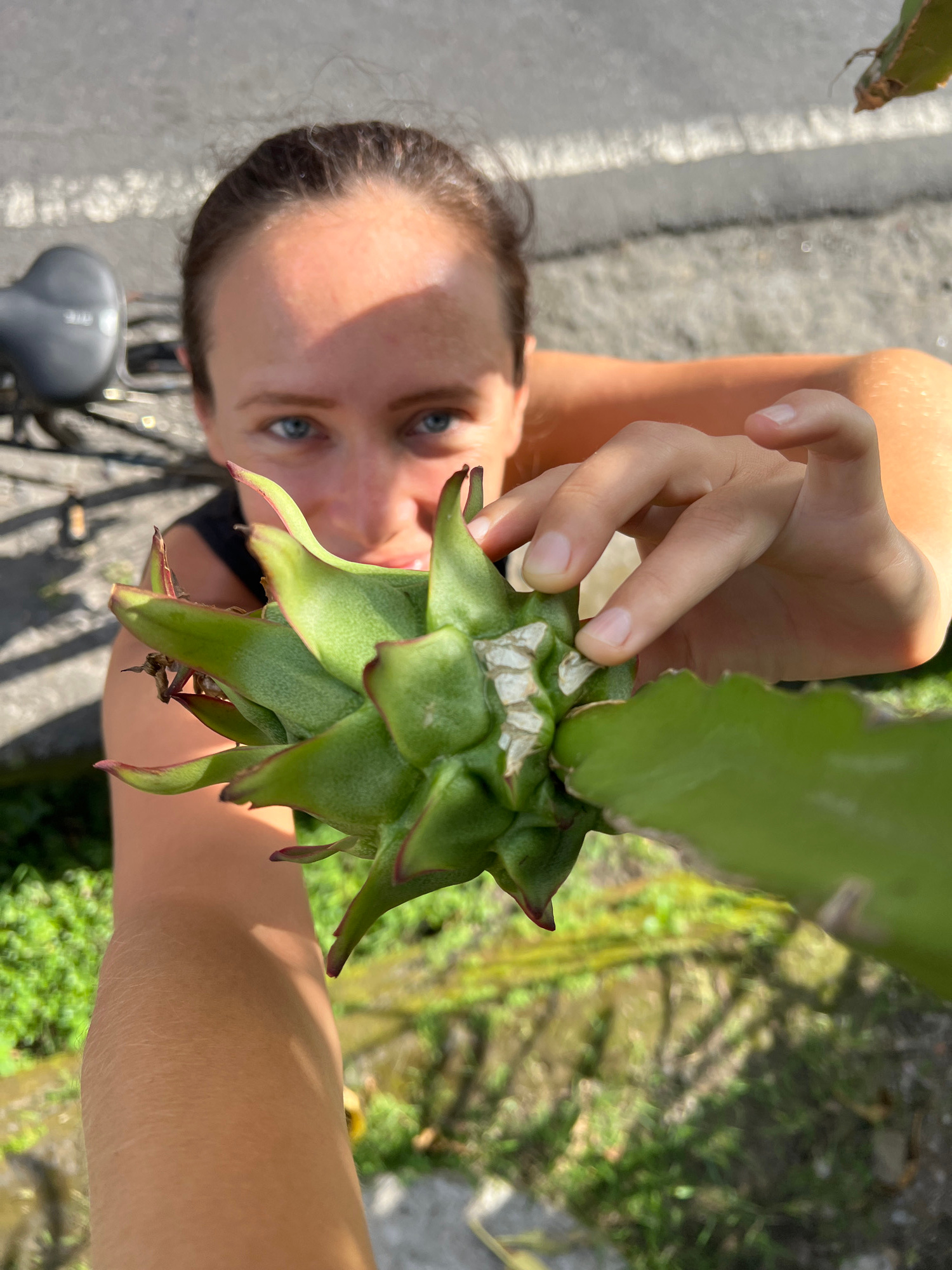 A person holds a green dragon fruit in front of their face, outdoors in Singakerta, Indonesia. The dragon fruit is unripe, with white patches on its surface and red-tipped leaves. The person has light…read more