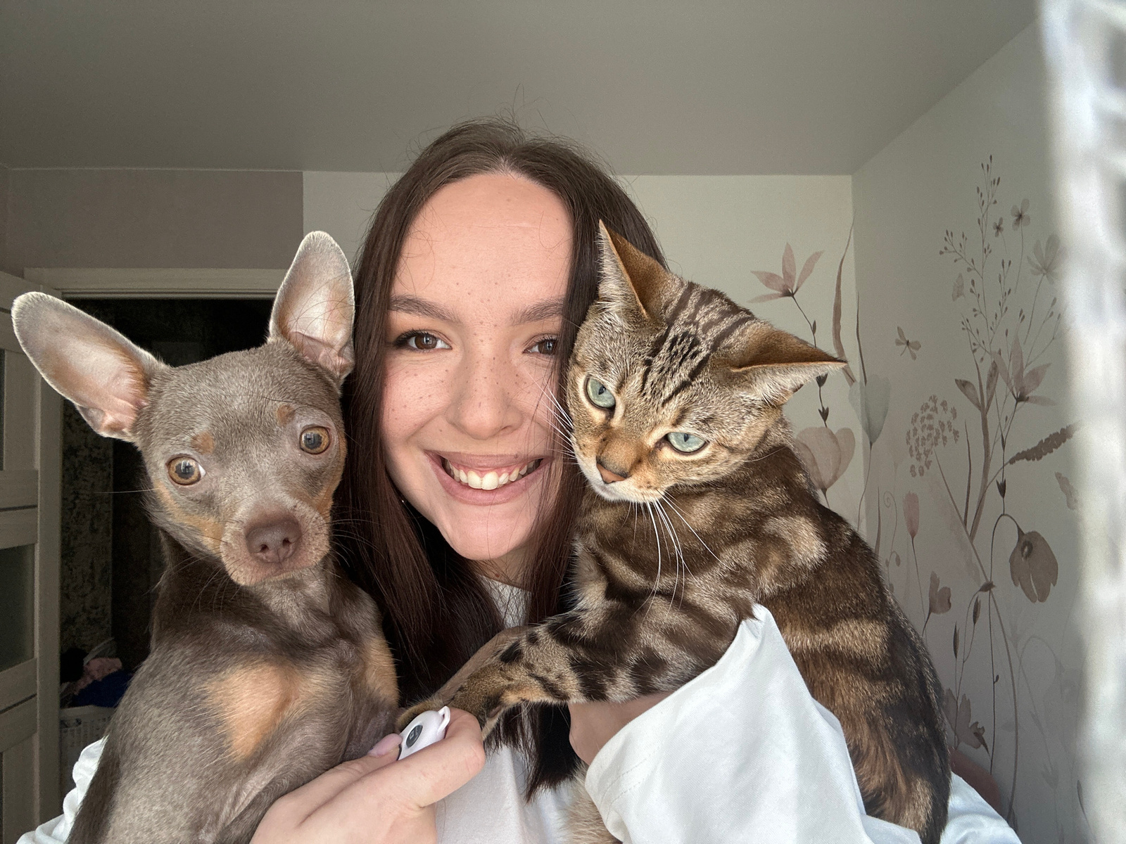 A photograph depicts a woman, a cat, and a dog. The woman has long brown hair, freckles, and is smiling, with her head positioned at the bottom center of the frame. To her left, a brown tabby cat look…read more