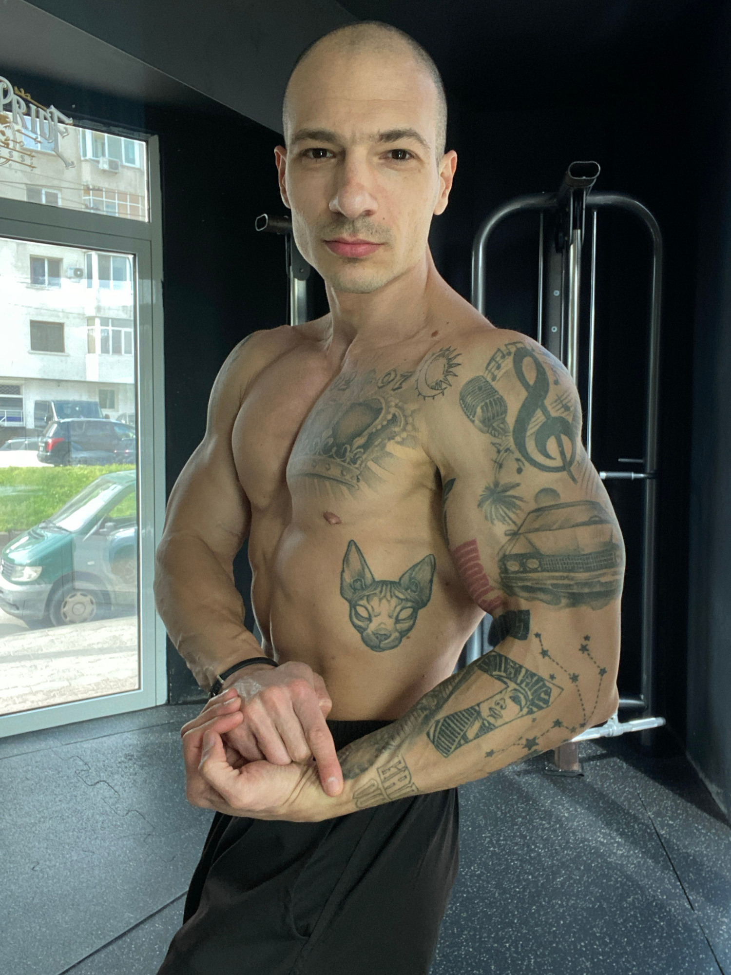 A muscular man with a shaved head and extensive tattoos is posing indoors, likely at a gym, given the equipment in the background. He is shirtless, flexing his arms, and wearing black shorts or pants.…read more